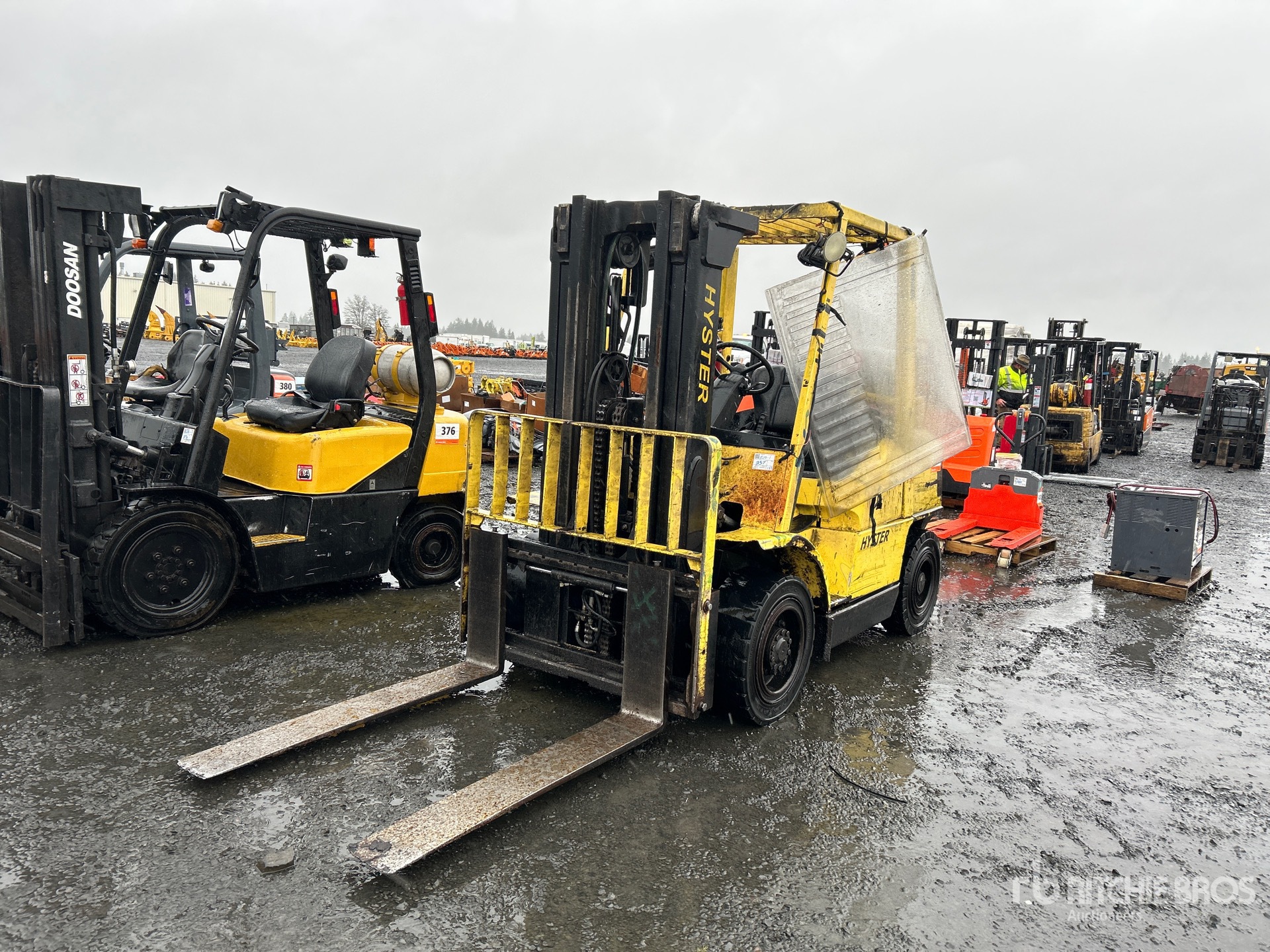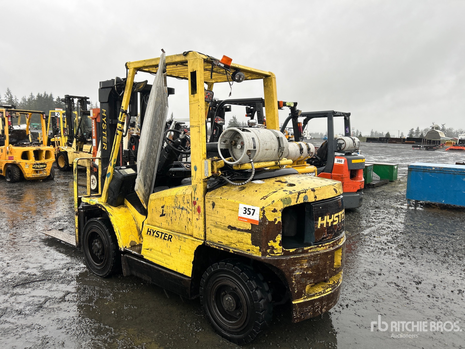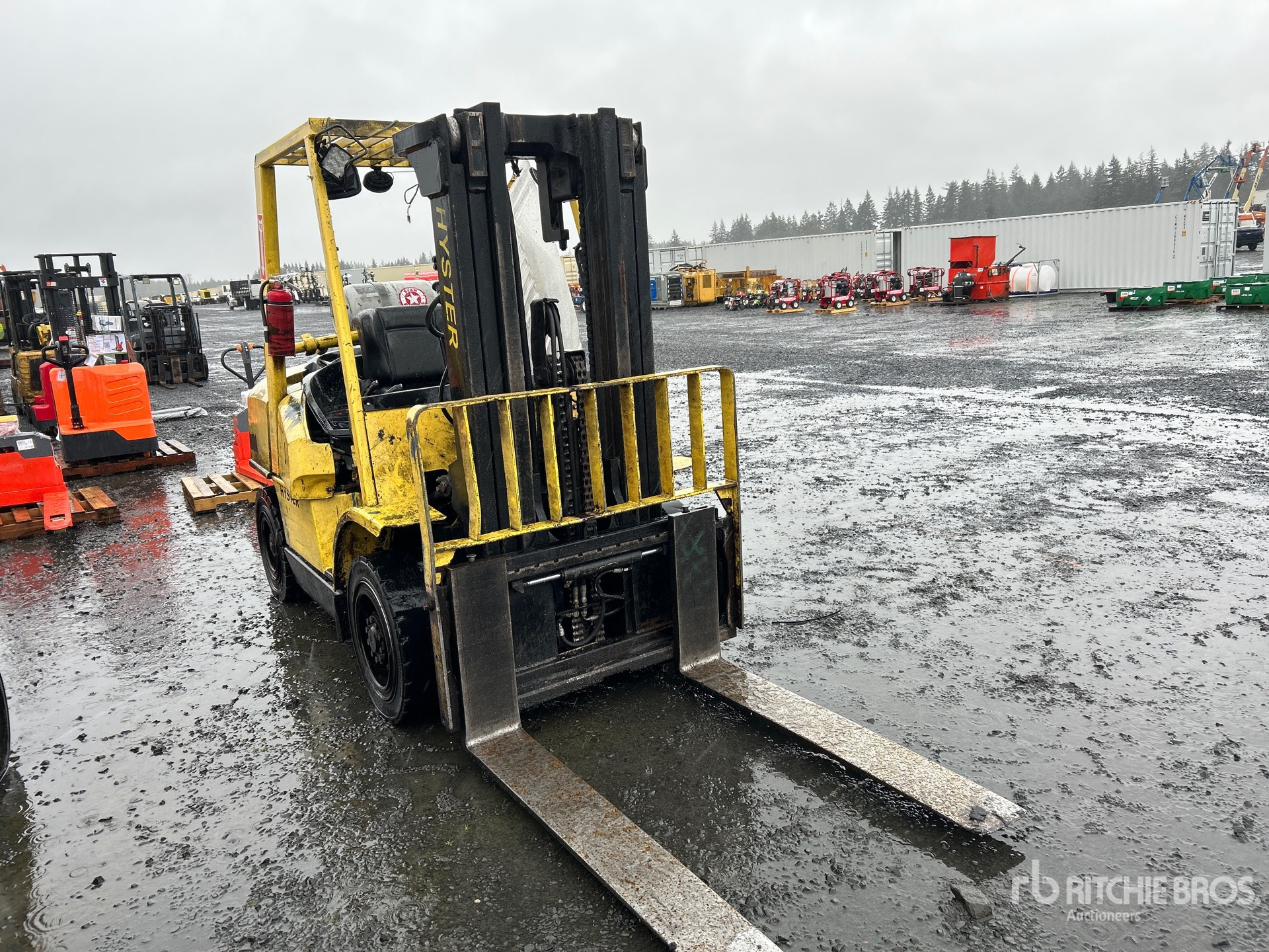 3 Stage Mast, 169 in Max Lift Height, 83 in Lowered Mast Height, 52 in Forks, Side Shift, Solid Pneumatic Tires, LPG Engine