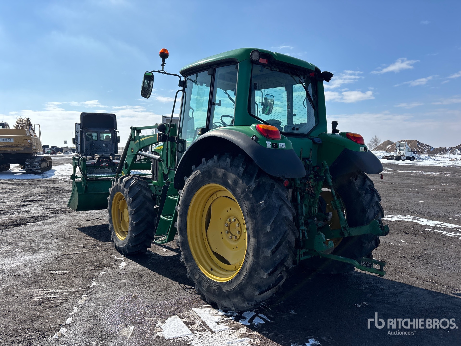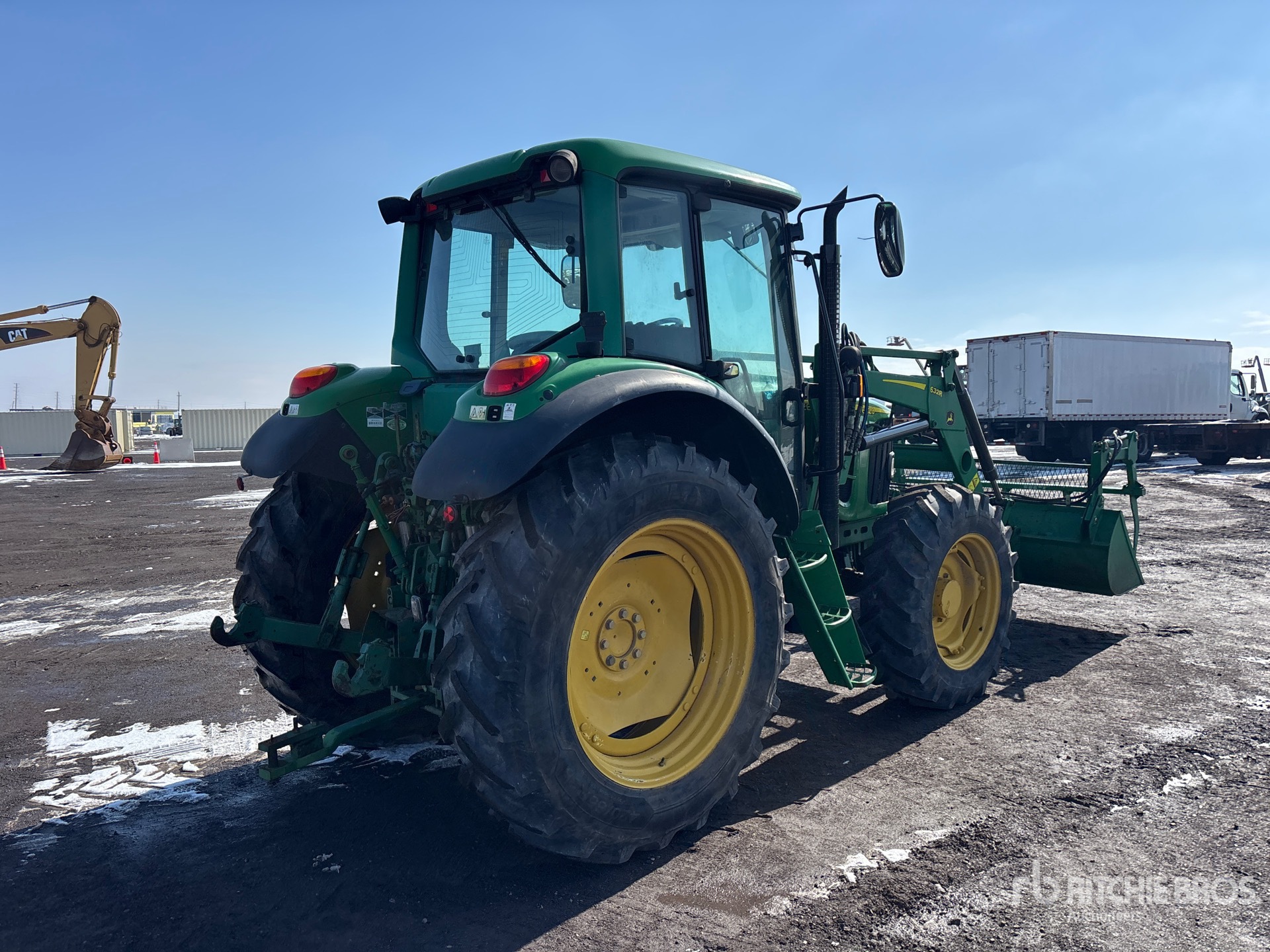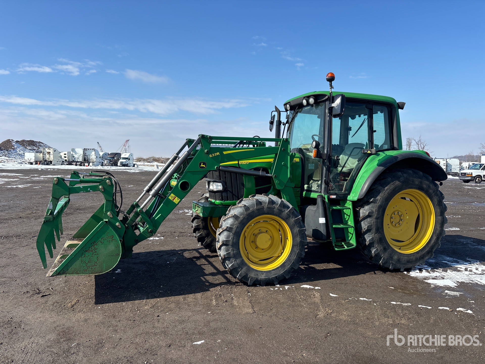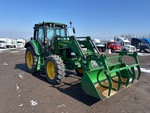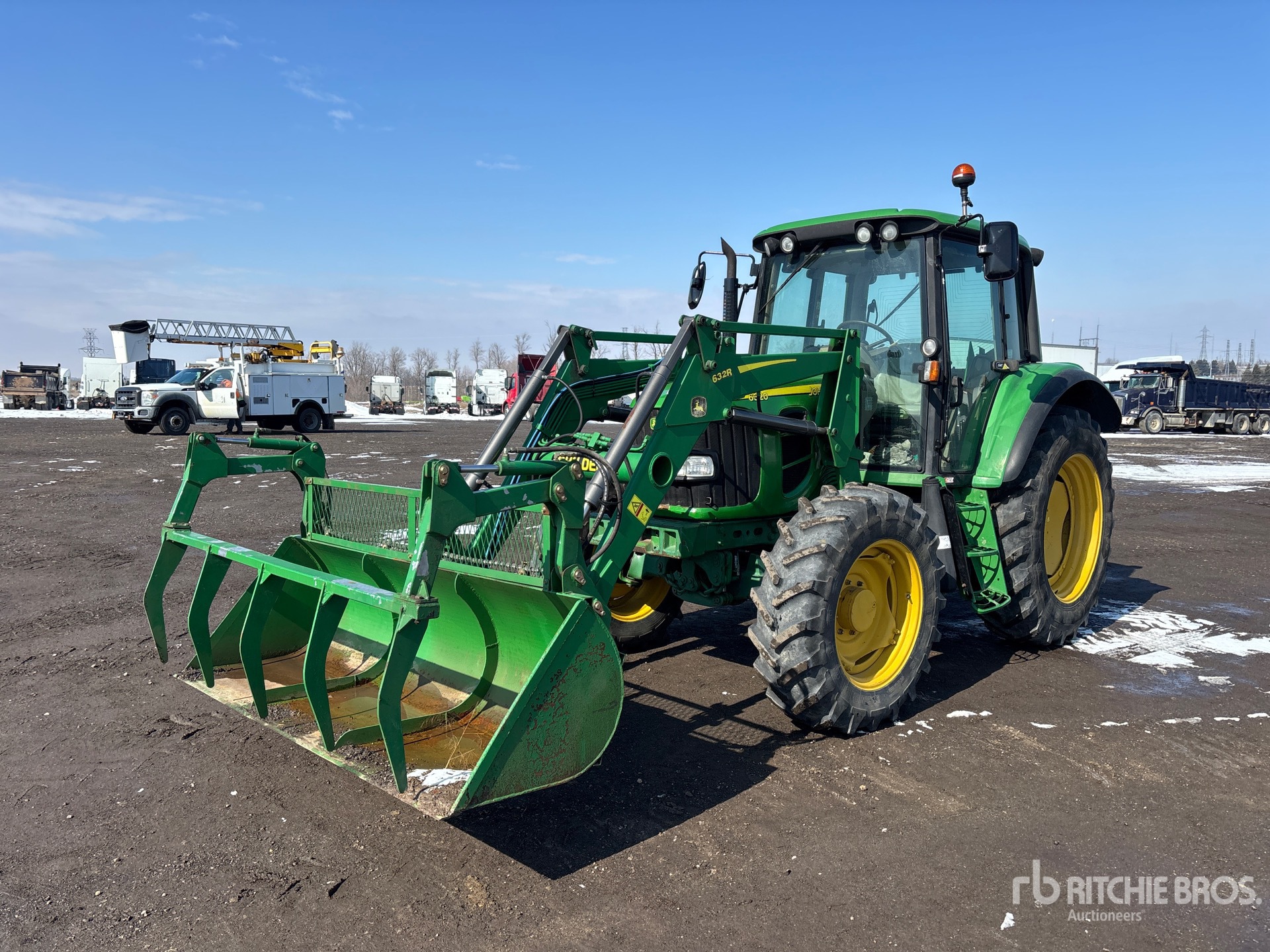 Enclosed Cab, Air Conditioner, Differential Lock, 24 Forward 24 Reverse, Partial power shift, John Deere 632R Loader, Quick Coupler, 79 in Grapple Bucket, Mid-Mount Remotes, 2 Rear Remotes, 540 PTO, 3-Point Hitch, Drawbar, 13.6x28 Front Tires, 420/85R38 Rear Tires