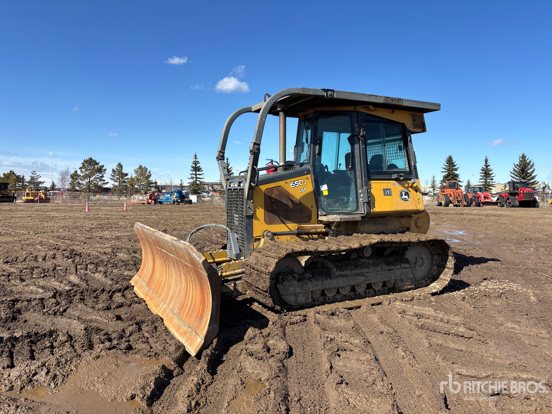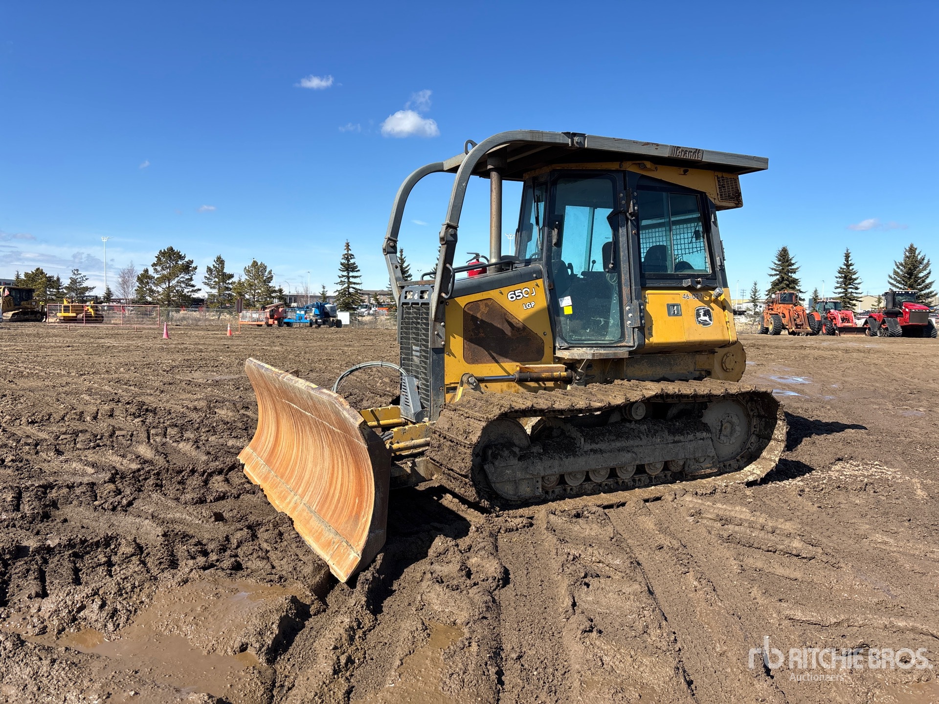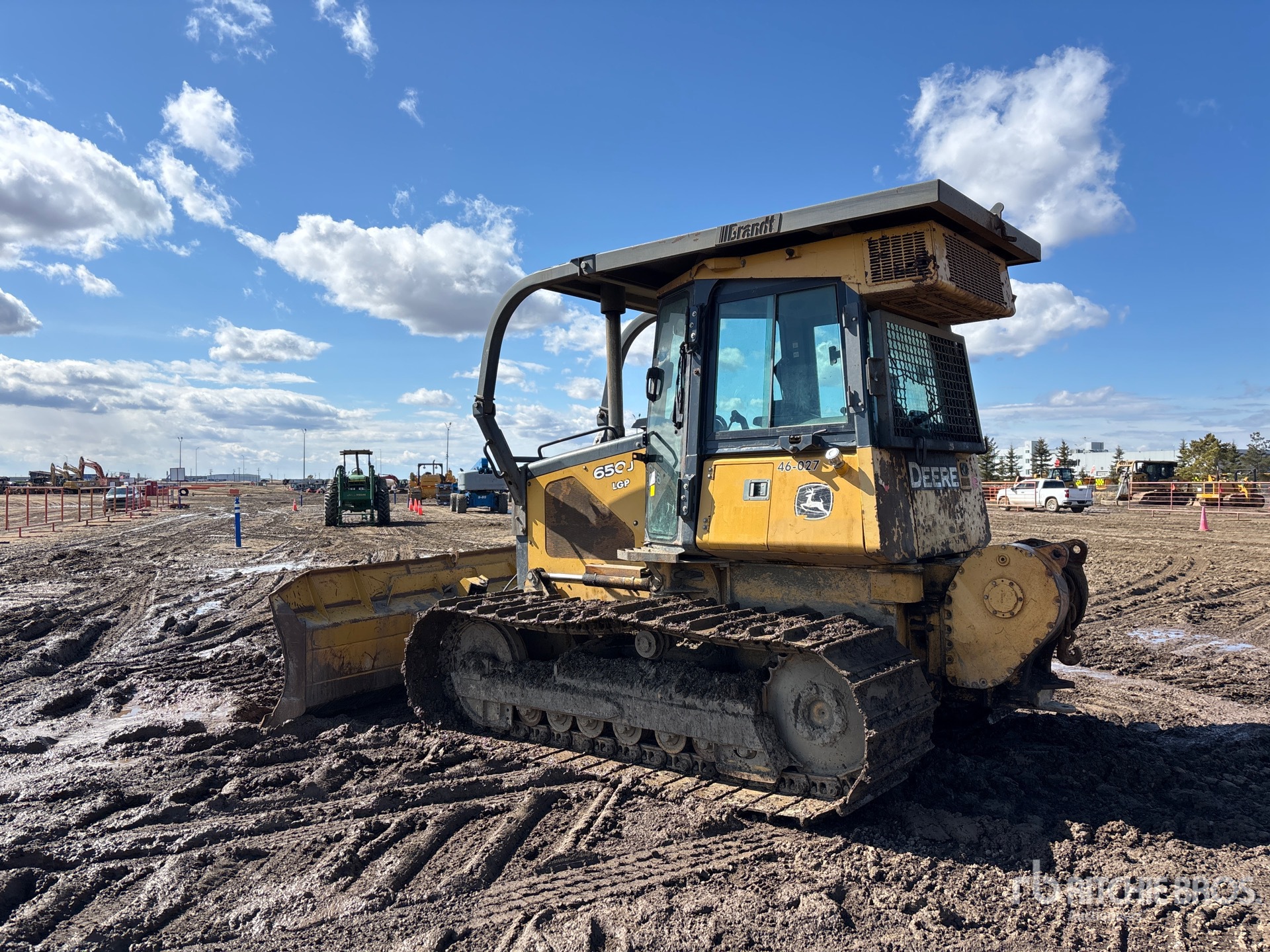 Enclosed Cab, Air Conditioner, Sweeps, 128 in Wide PAT Blade, 28 in Single Grouser Track Shoes, John Deere Winch, Drawbar
