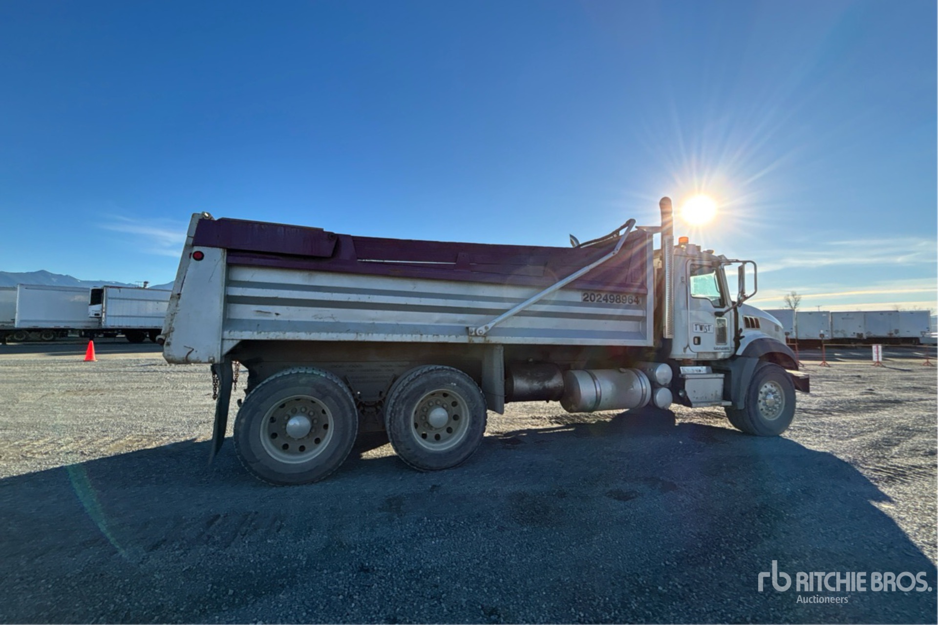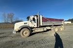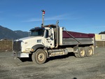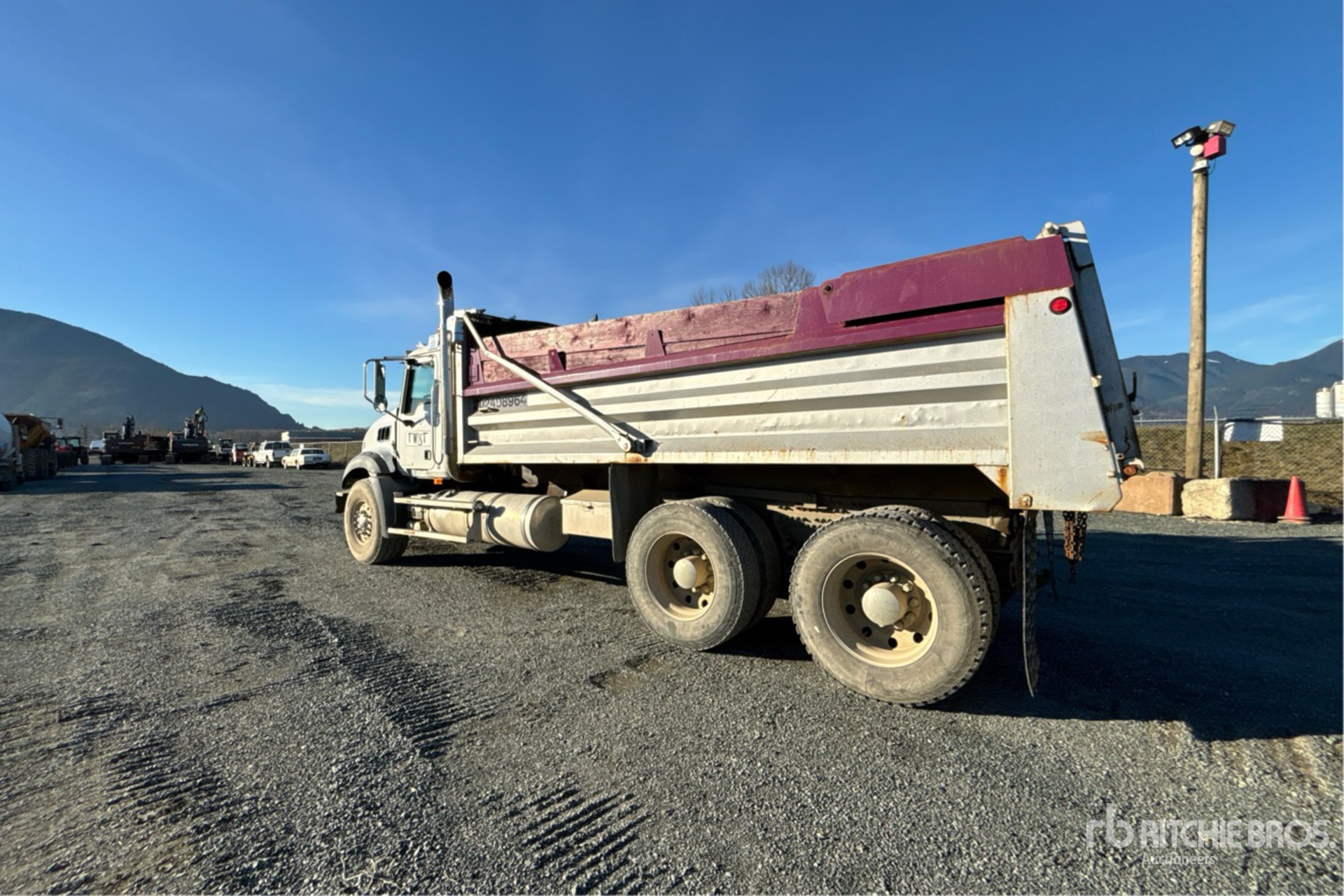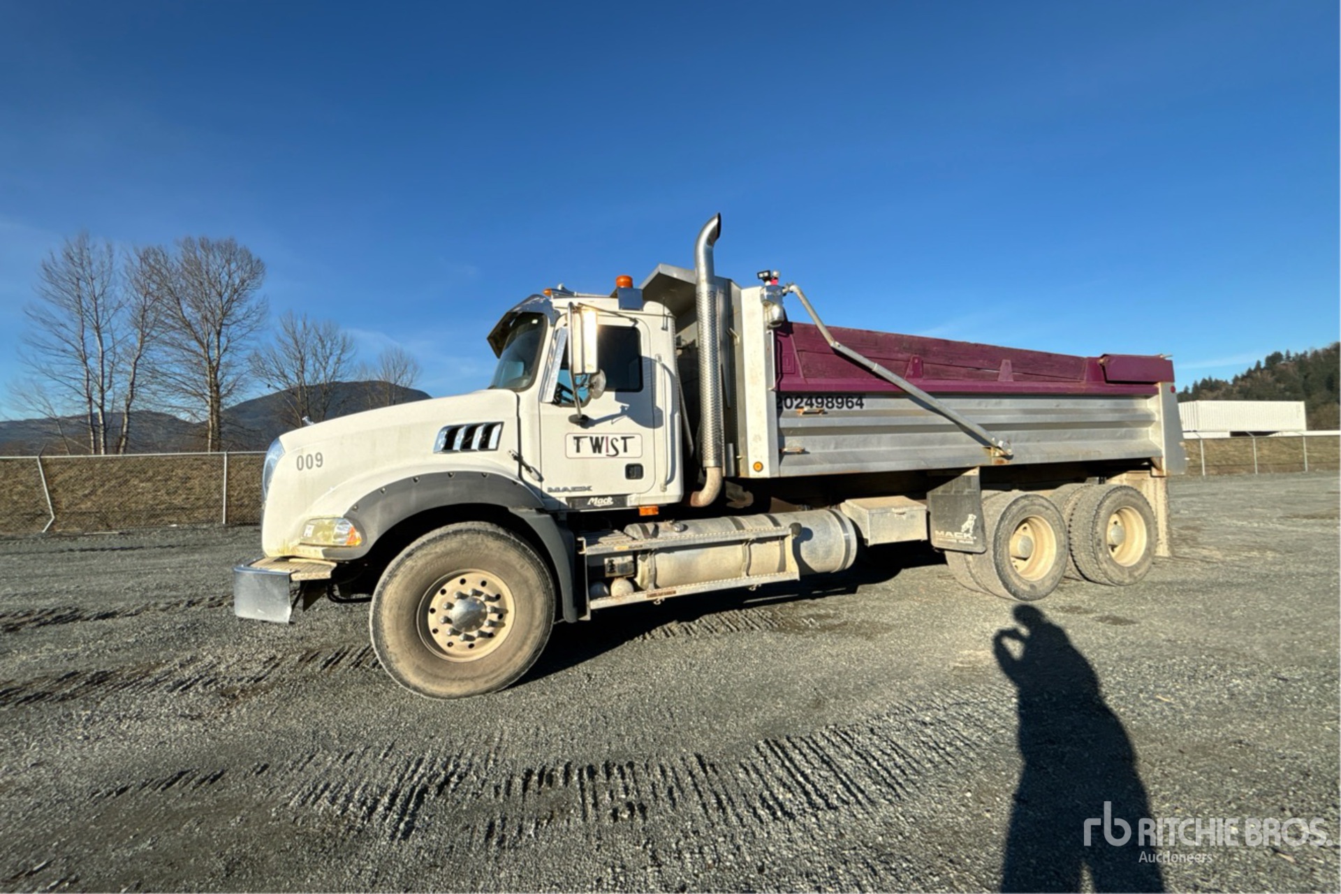 Mack MP8 6 Cylinder 12.8 L Diesel 485 hp Engine, 2008 US EPA Label, CARB Compliant, Webasto Engine Coolant Heater, 21209 Engine hrs, Eaton Fuller 18-Speed Manual Transmission, Differential Lock, 9100 kg Front Axle, 20800 kg Rears, 29900 kg GVWR, Aluminum Wheels, 385/65R22.5 Front Tires, 11R24.5 Rear Tires, Rubber over Walking Beam Suspension, 230 in Wheelbase, PTO, Nahanni 18 ft Long x 4 ft 3 in High Steel Body, Air Powered Roll Tarp, Tailgate Chute, Pintle Hitch