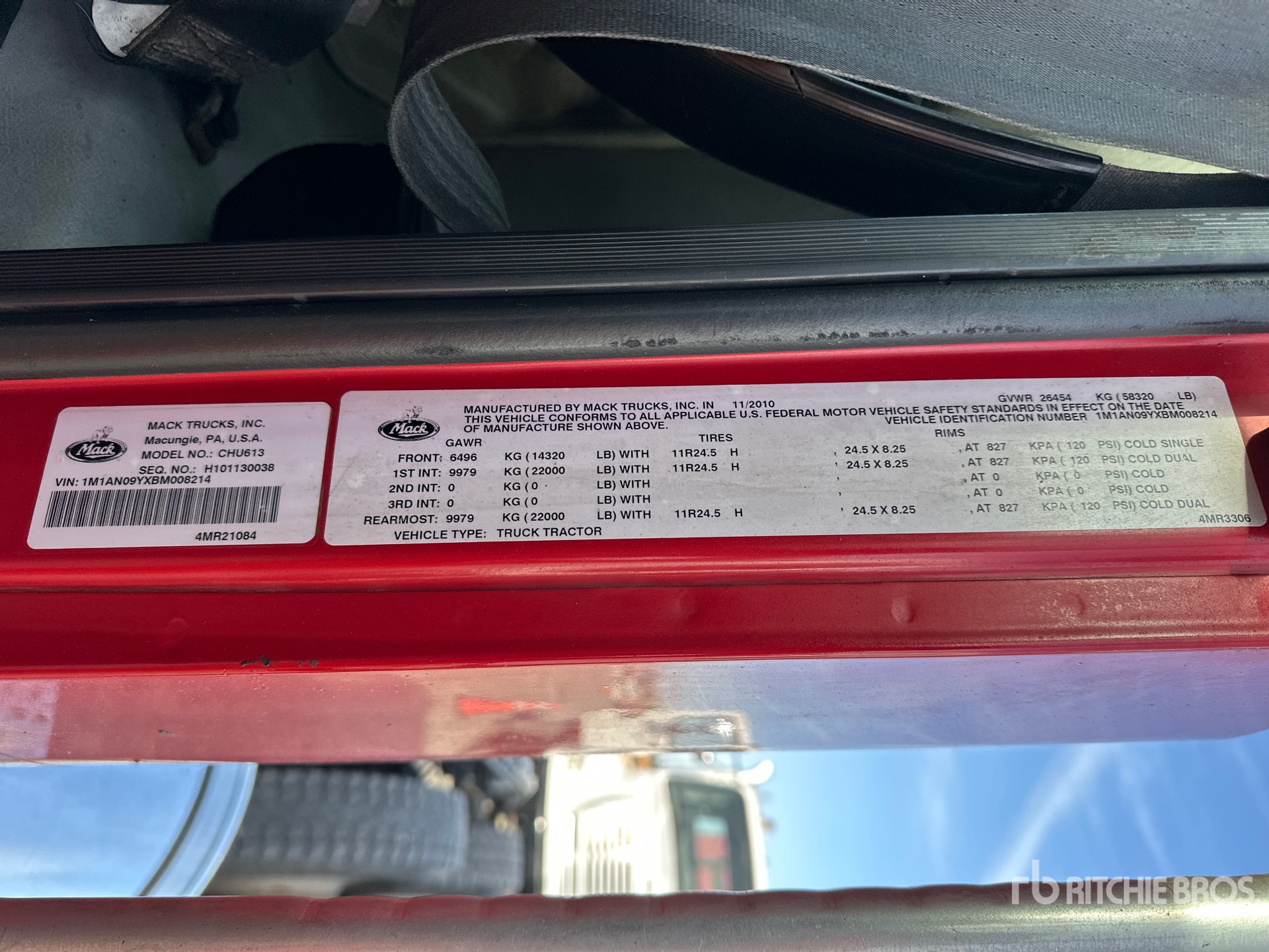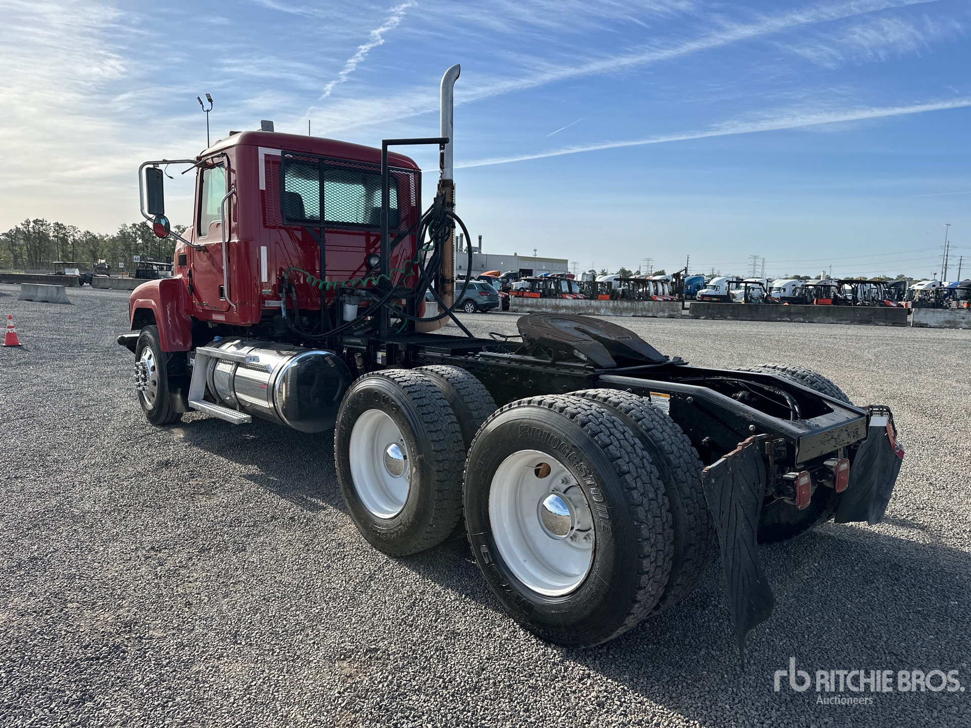 Located in Lane 31 Spot 40, Mack MP8 290 hp Engine, 2010 US EPA Label, Eaton Fuller RTLO-16913A 13-Speed Manual Transmission 14320 lb Front Axle, 44000 lb Rears, 58320 lb GVWR, Engine Brake, 207 in Wheelbase, Spring Suspension, Aluminum Front Wheels, 11R24.5 Front Tires, 11R24.5 Rear Tires, Air Sliding 5th Wheel, Dual Fuel Tanks