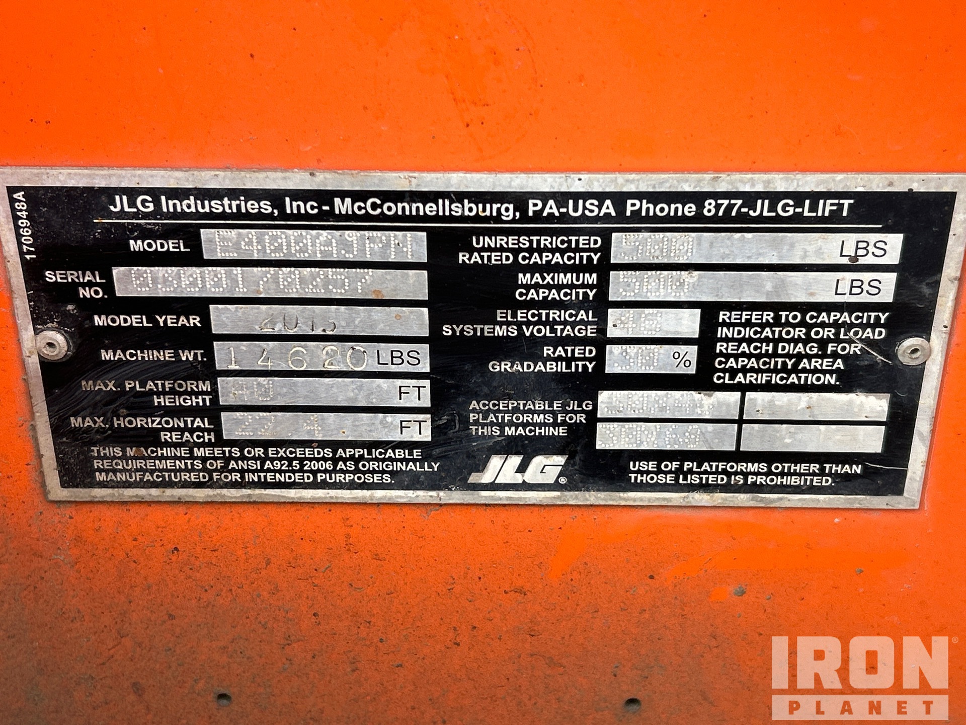 40 ft Max Platform Height, 500 lb Max Weight Capacity, Jib, Power to Platform, Non-Marking Tires