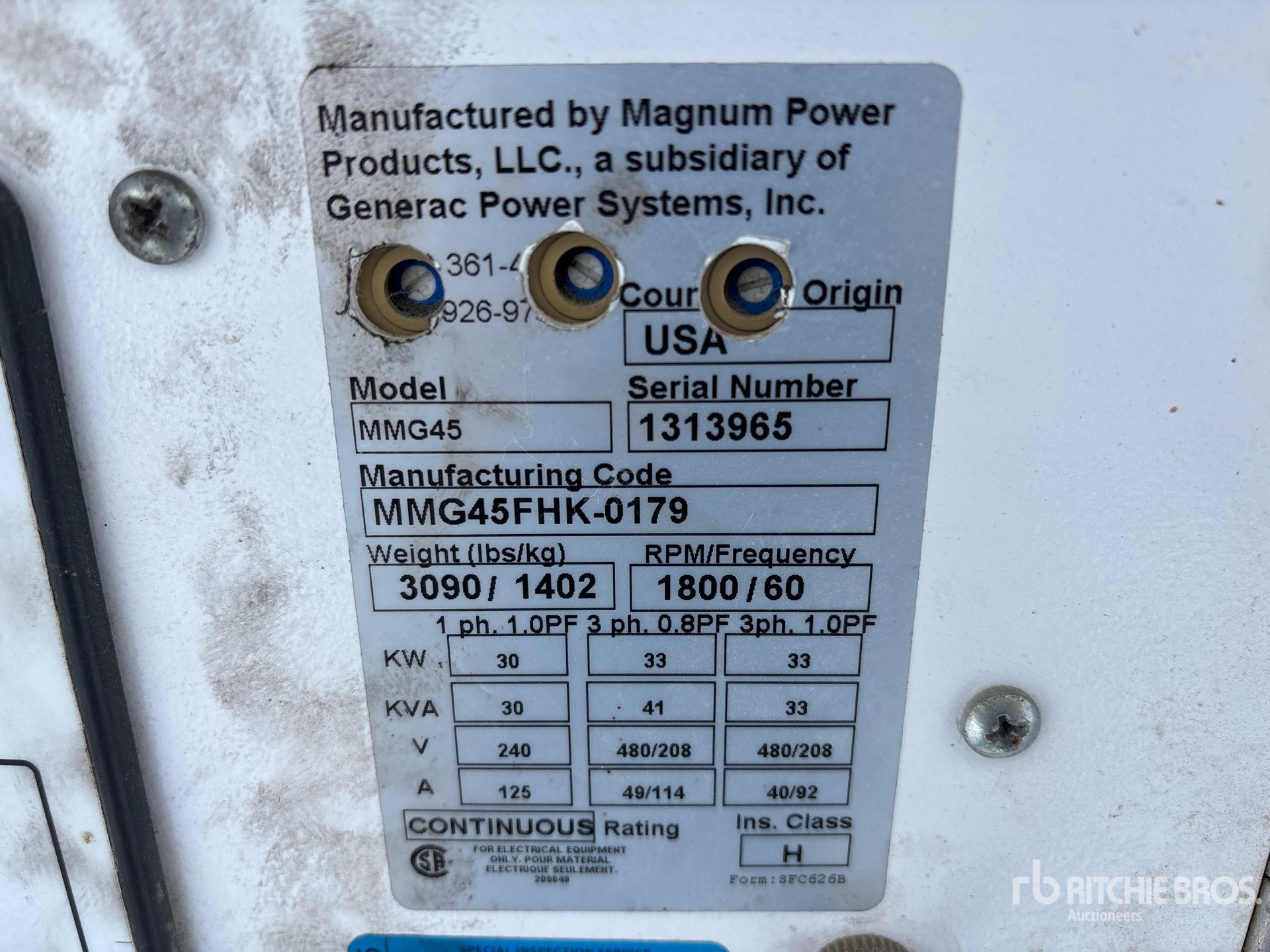 2012 US EPA Label, CARB Compliant, Kubota 4 Cylinder 46 kW 3.6 L Diesel Engine, Positive Air Shutoff, 33 kVA/33 kW Rated 3 Phase Output, 480 V / 208 V Rated Voltage, 30 kVA,/30 kW, Rated Single Phase Output, 240 V Rated Voltage, Bottom Mounted Fuel Tank