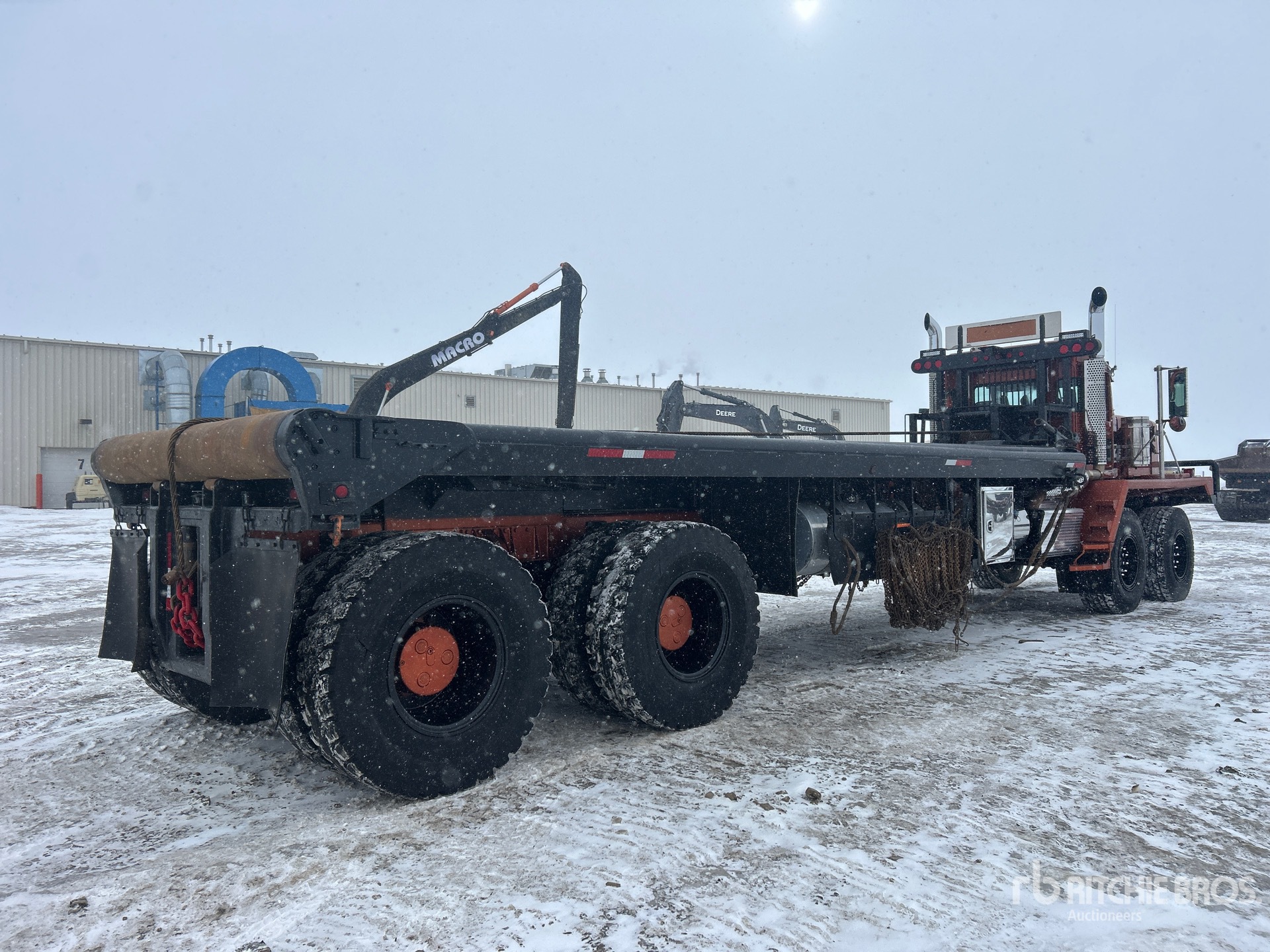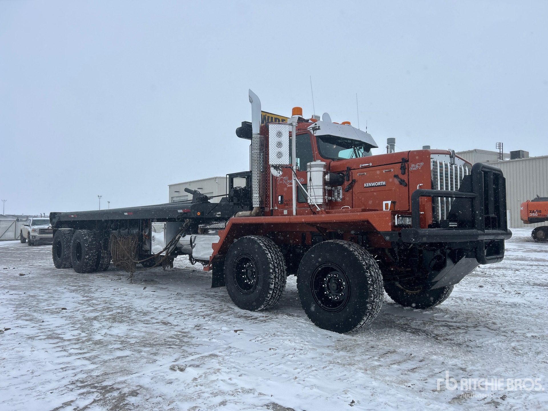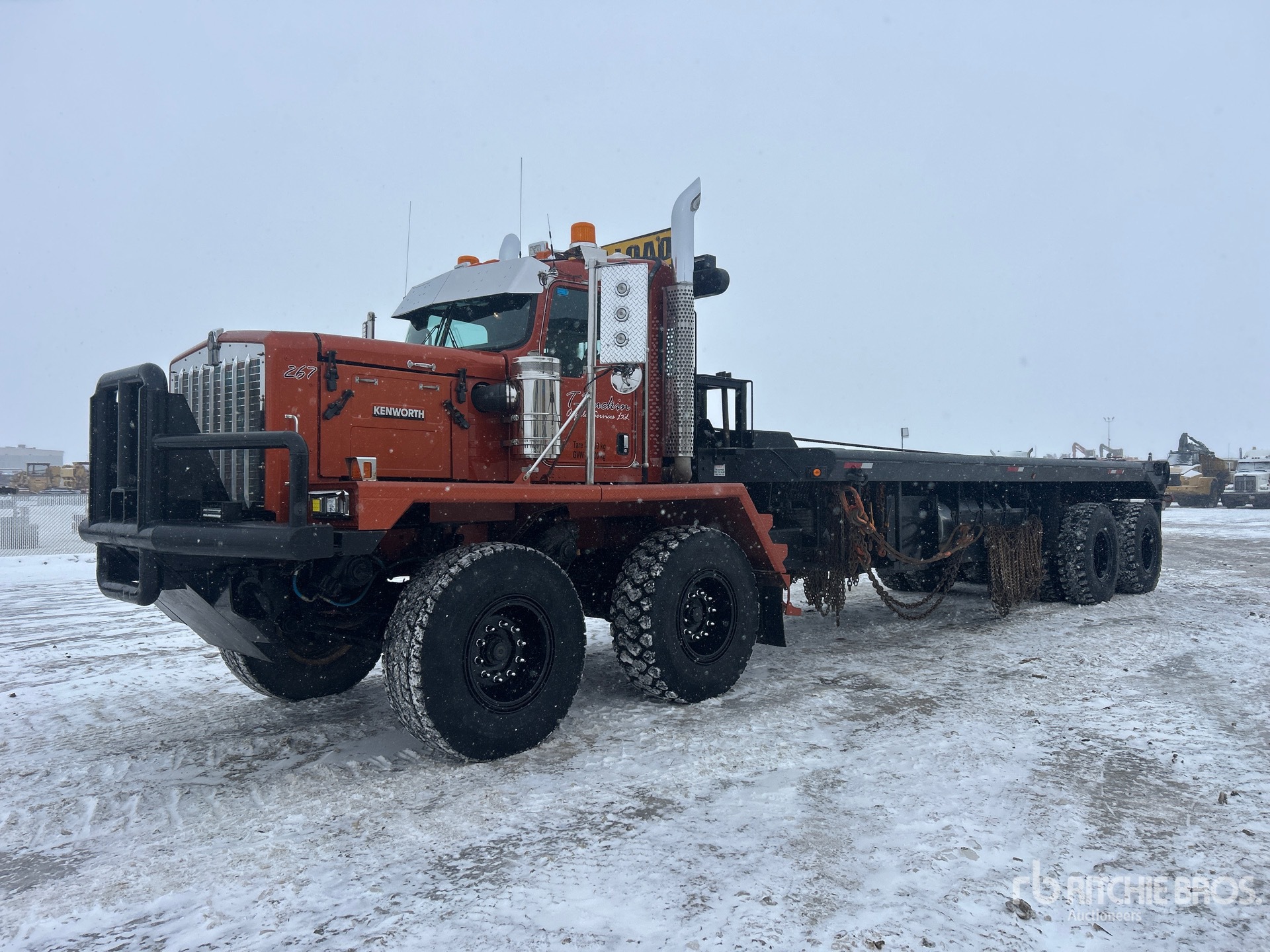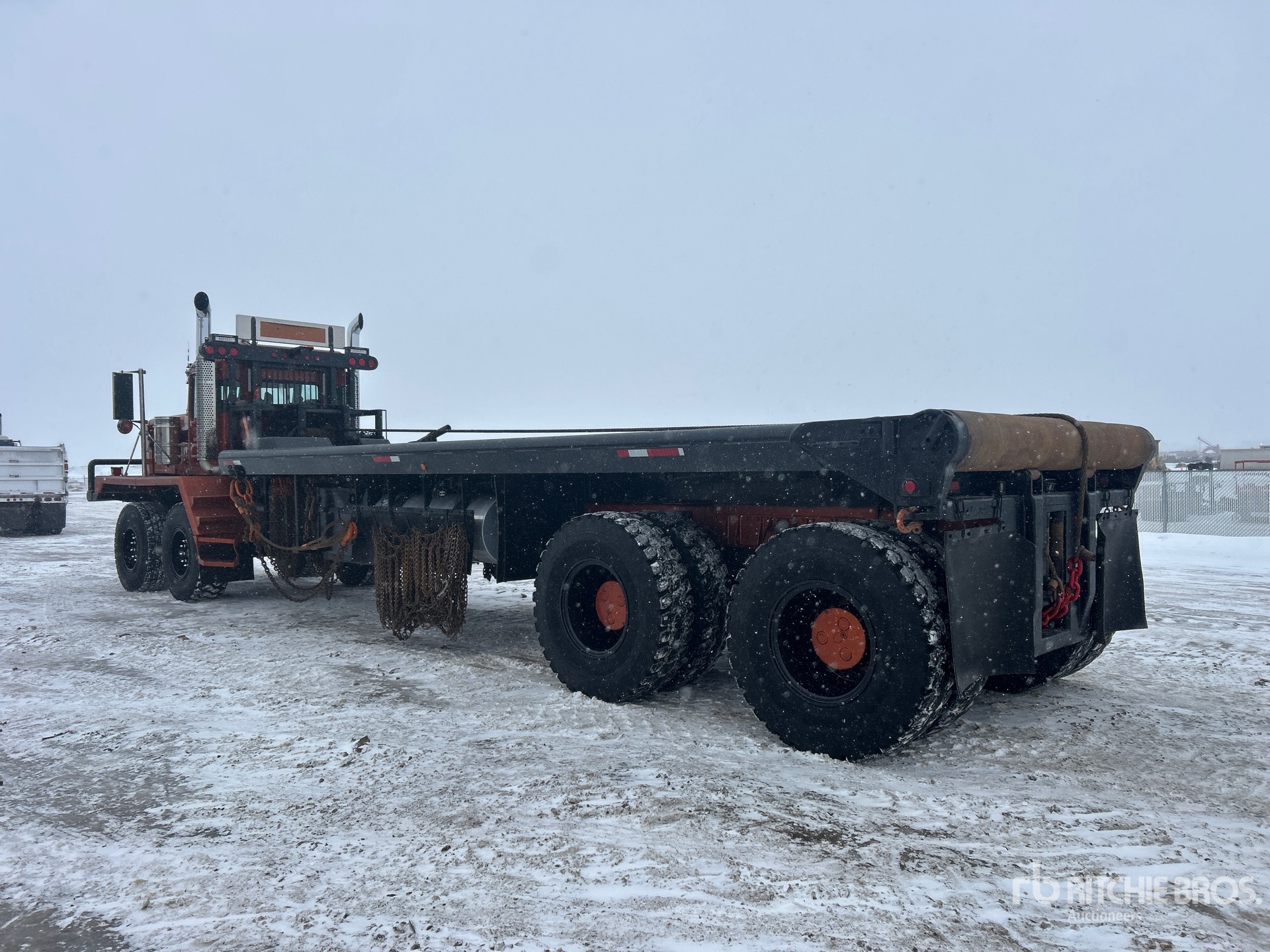 Cummins ISX15 6 Cylinder 15 L Diesel 550 hp Engine, 2014 US EPA Label, CARB Compliant, Engine Coolant Heater, Positive Air Shutoff, 11006 Engine hrs, Engine Brake, Allison 4700RDS Automatic Transmission, Spicer APO1750-4C 4-Speed Auxiliary Transmission, Double Differential Locks, 17146 kg Front Axle, 44906 kg Rears, Kessler D91 Planetary Drive Axles, 9.99:1 Axle Ratio, 62053 kg GVWR, 17.5R25 Front Tires, 14.00R25 Rear Tires, Dual Steering Boxes, Double Frame, Chalmers Walking Beam Suspension, 380 in Wheelbase, PTO, Wet Kit, 30 ft x 120 in Bed, Center Roll, Live Roll, 26 ft Gin Poles, Tulsa Hydraulic Winch, Tulsa Hydraulic Winch, Flip-Over 5th-Wheel, Complete-Dispersal-for-T-Ruckin-Oilfield-Services-Ltd