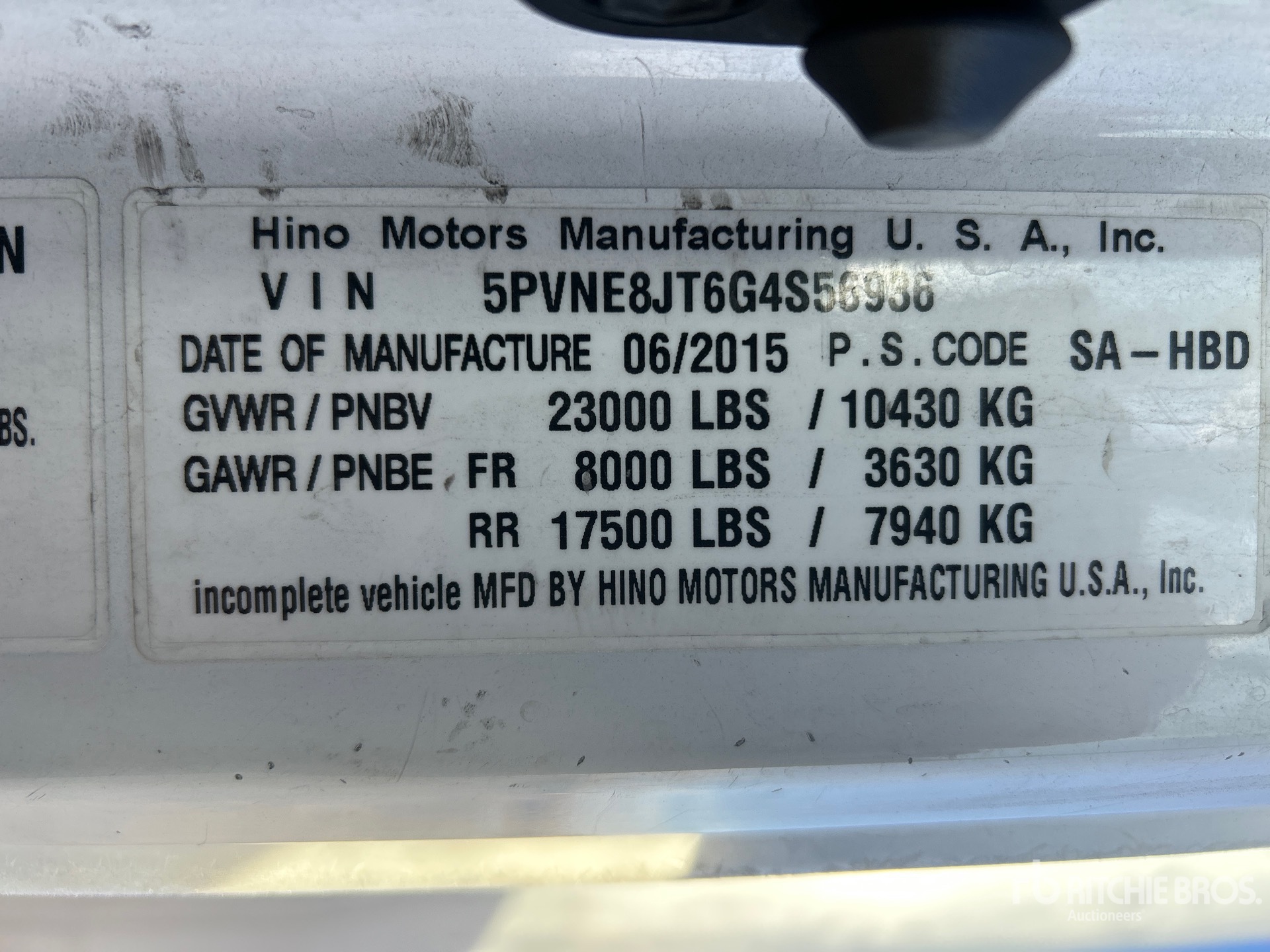Hino Motors J08E-VC 6 Cylinder 7.7 L Diesel 220 hp Engine, 2015 US EPA Label, Requires Diesel Exhaust Fluid, Automatic Transmission, 8000 lb Front Axle, 17500 lb Rears, 23000 lb GVWR, 295/75R22.5, Spring Suspension, 253 in Wheelbase, 24 ft x 102 in Wide x 102 in High Body, Liftgate