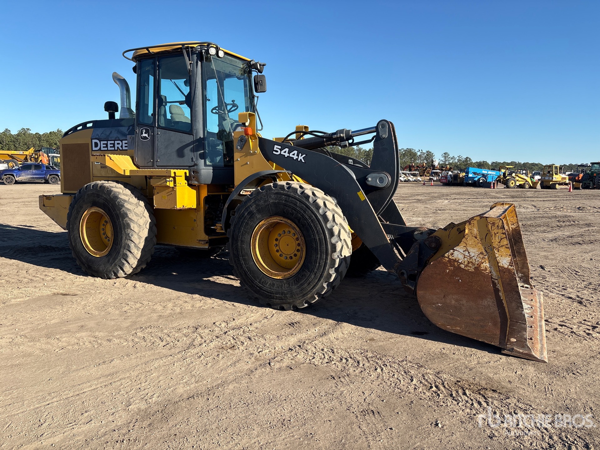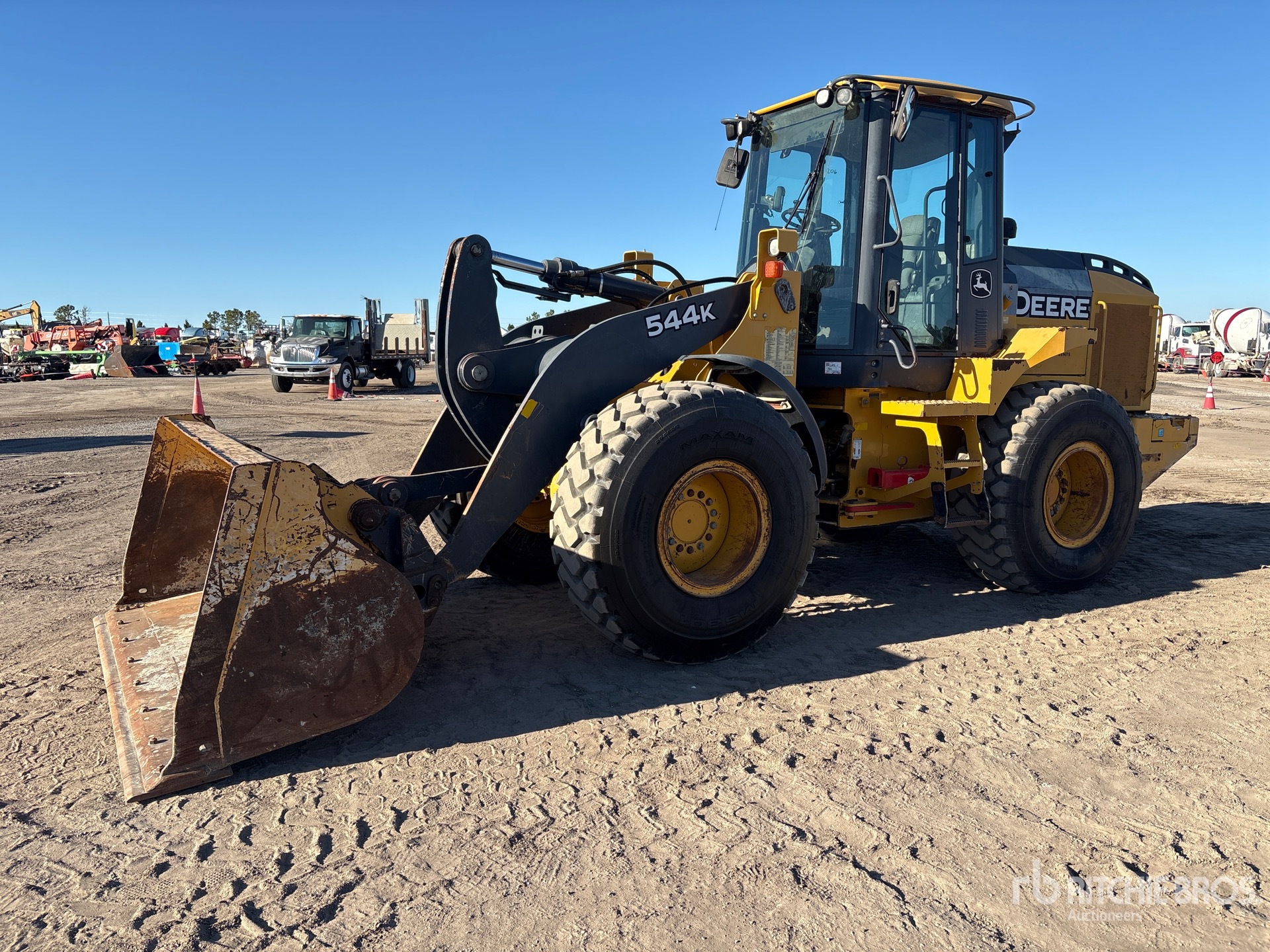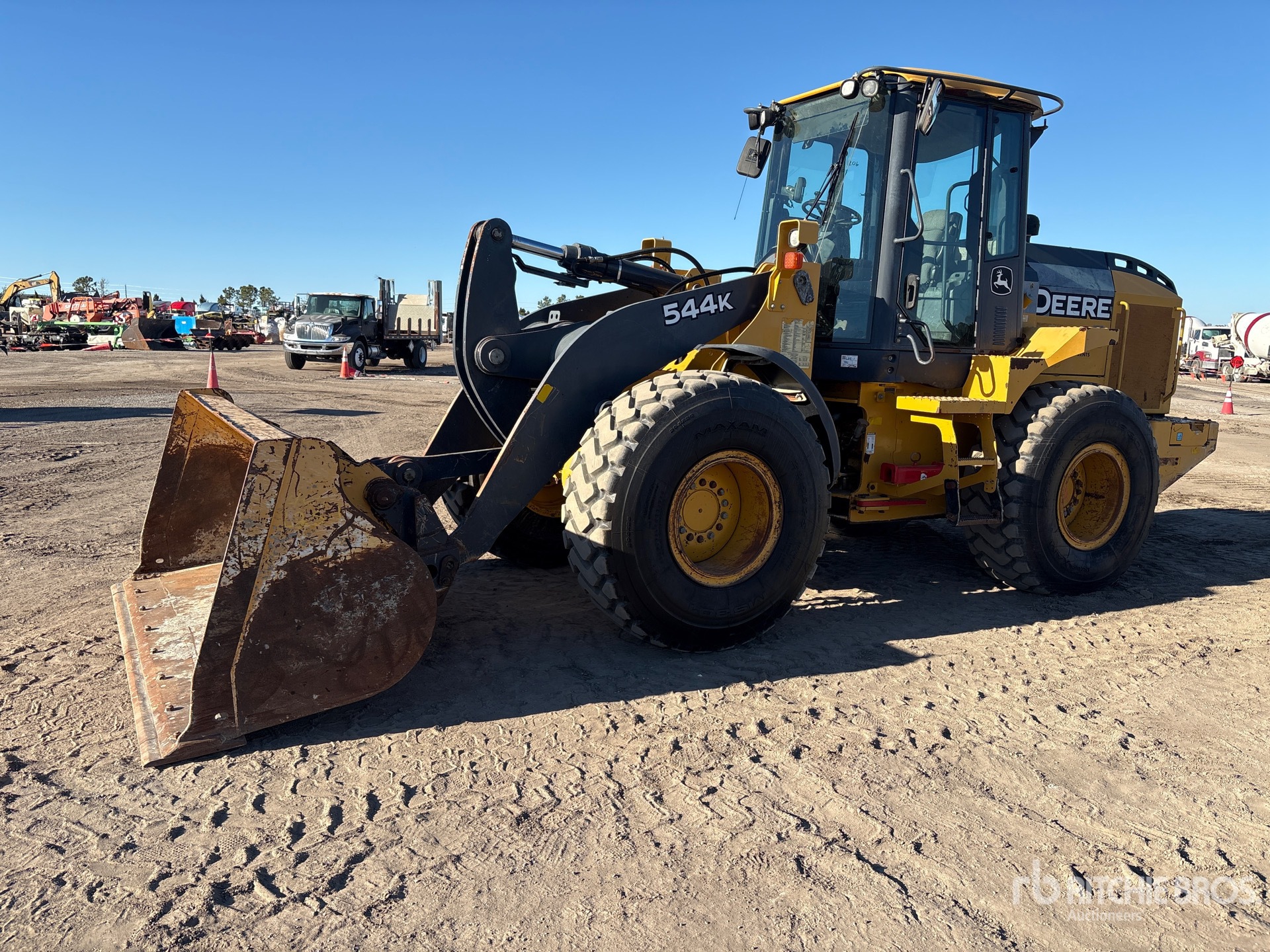 Located in Lane 3 Spot 305, Enclosed Cab, Air Conditioner, Ride Control, Hydraulic Coupler, Bucket, Forks, 20.5R25 Tires
