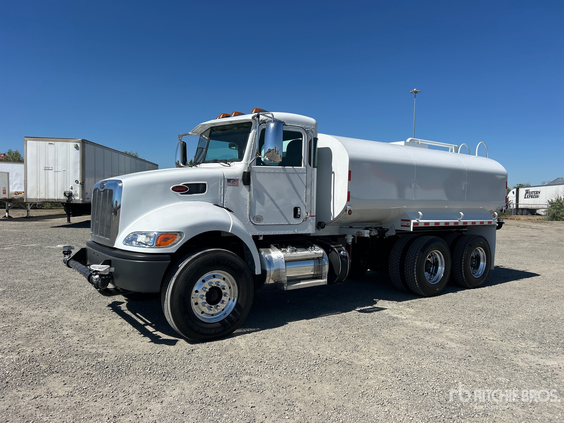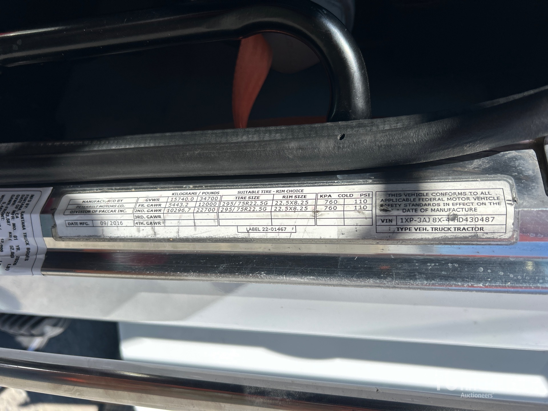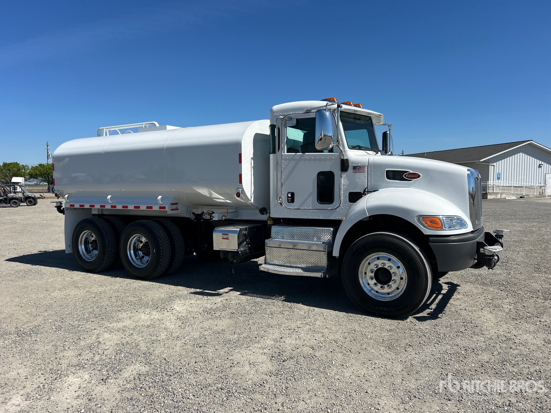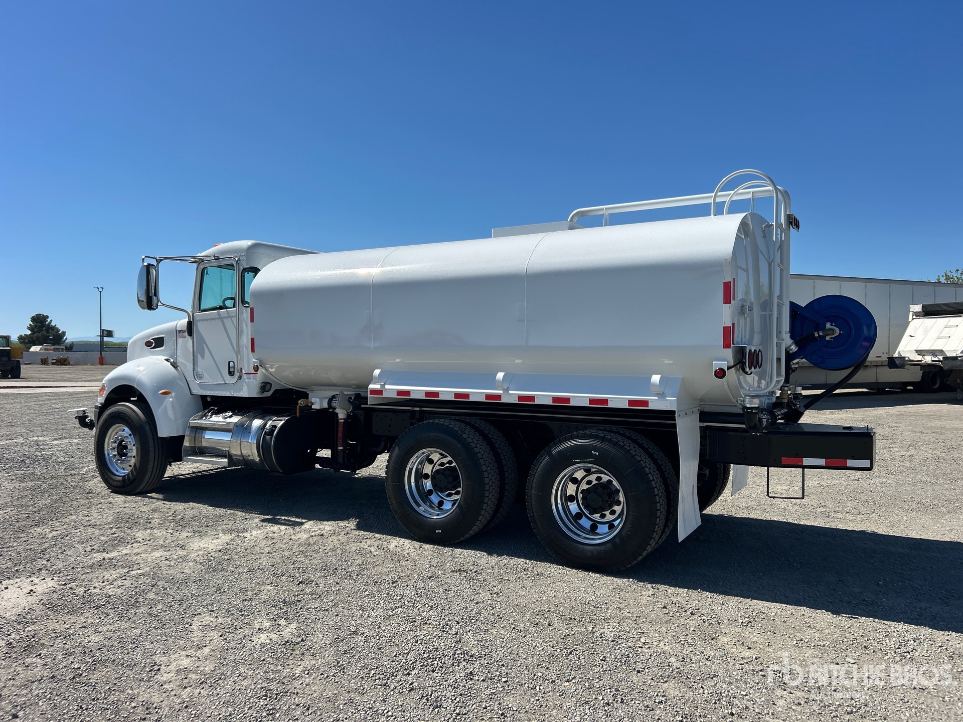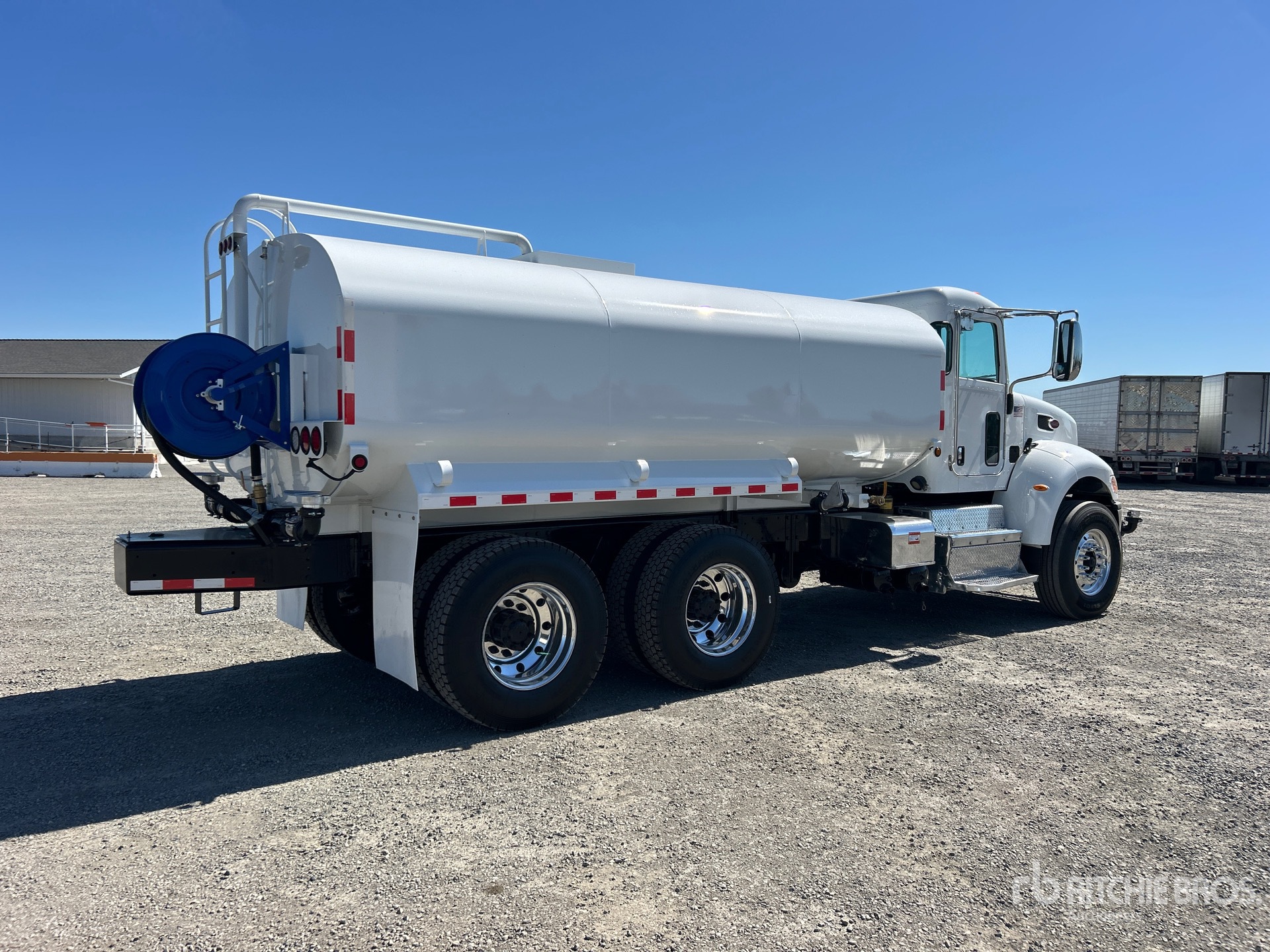 Located in Lane 8 Spot 4, Paccar PX-9 8.9 L Diesel 345 hp Engine, 2016 US EPA Label, Requires Diesel Exhaust Fluid, 4898 Engine hrs, Eaton Fuller Automated Transmission, 12000 lb Front Axle, 22700 lb Rears, 34700 lb GVWR, Aluminum Outer Wheels, 315/80R22.5 Front Tires, 11R22.5 Rear Tires, Hendrickson Haulmaax Rubber Suspension, 197 in Wheelbase, Steel Tank, PTO Driven Pump, Hose Reel, Front Spray, Rear Spray, Side Spray