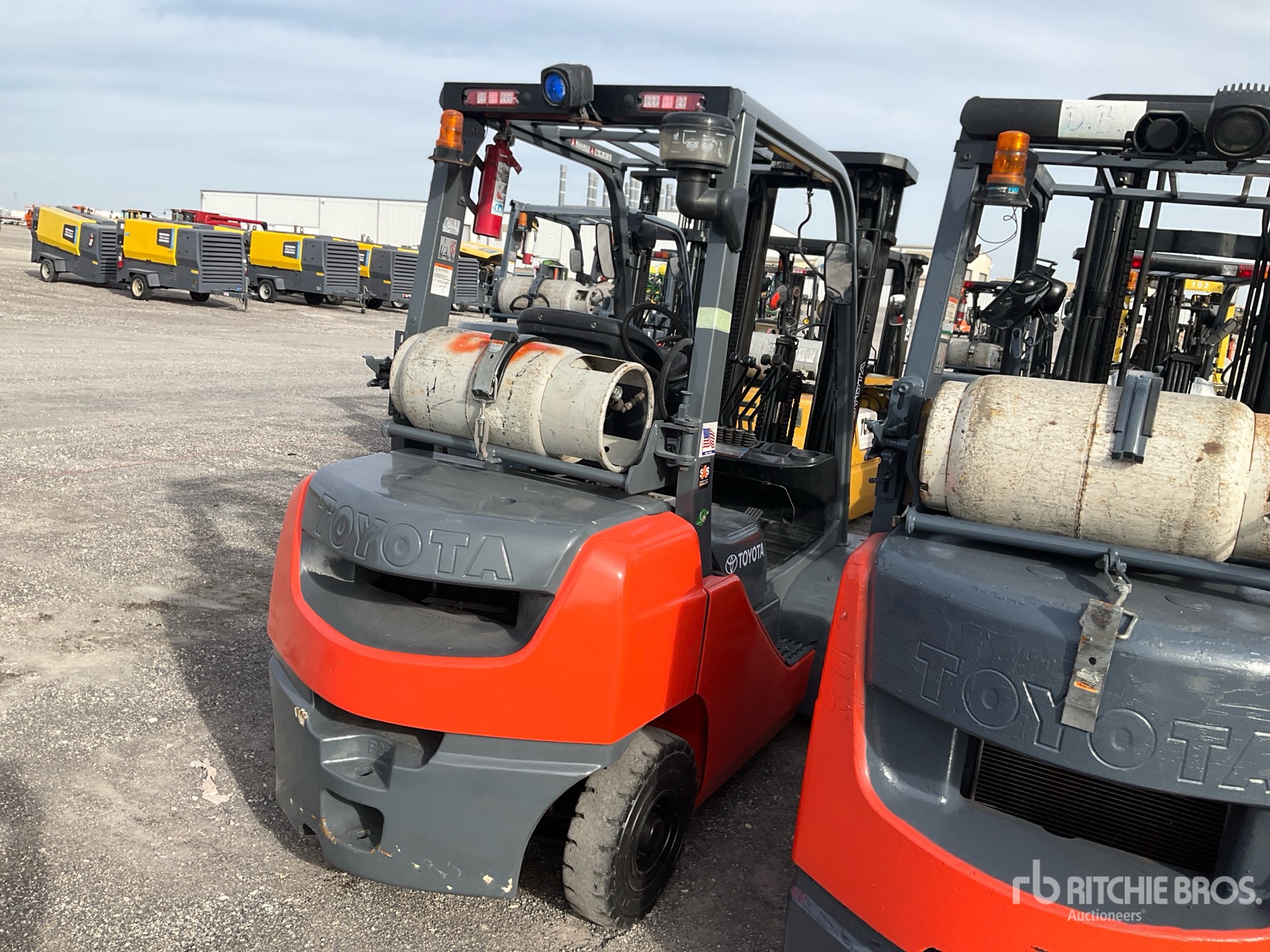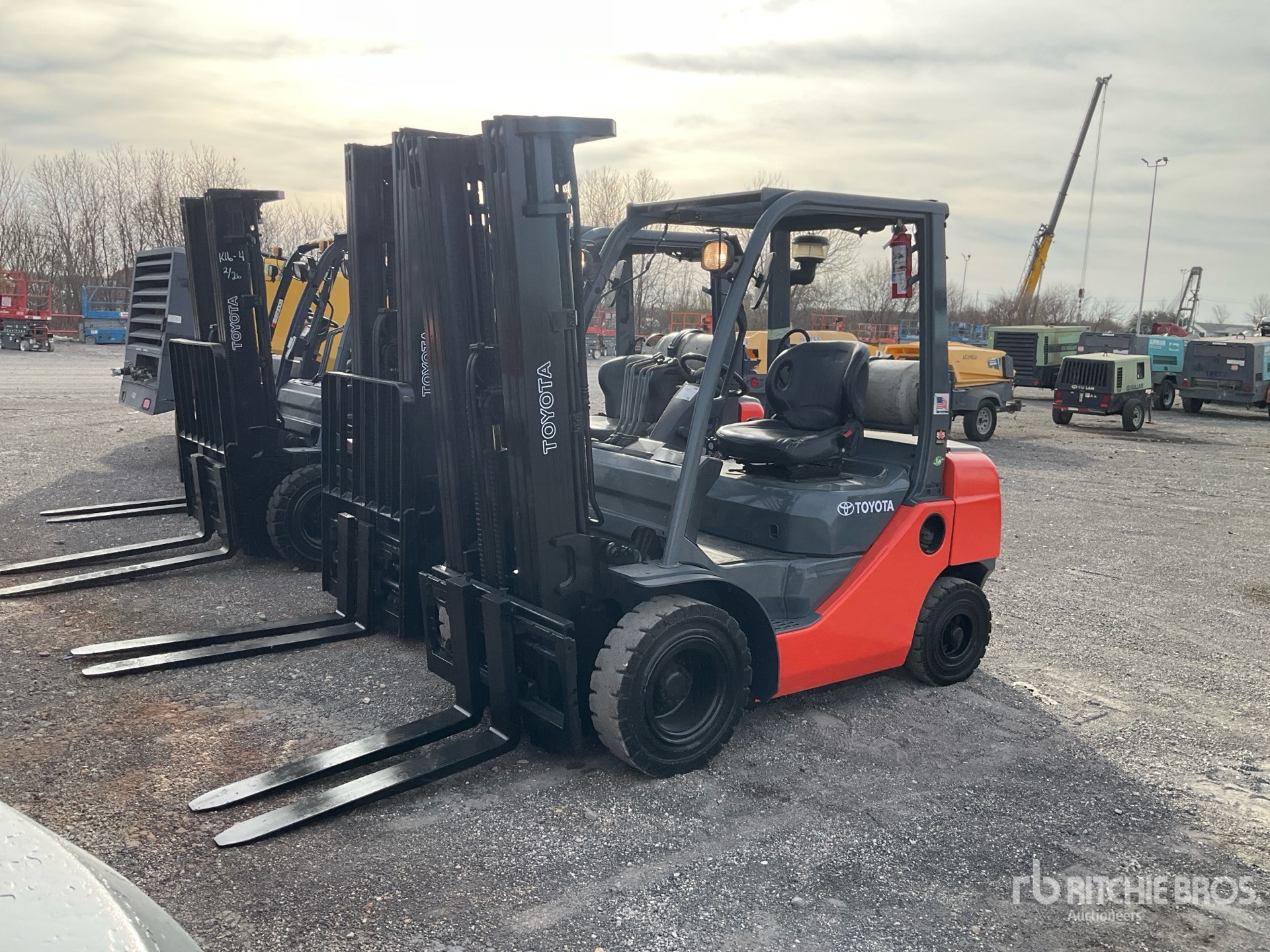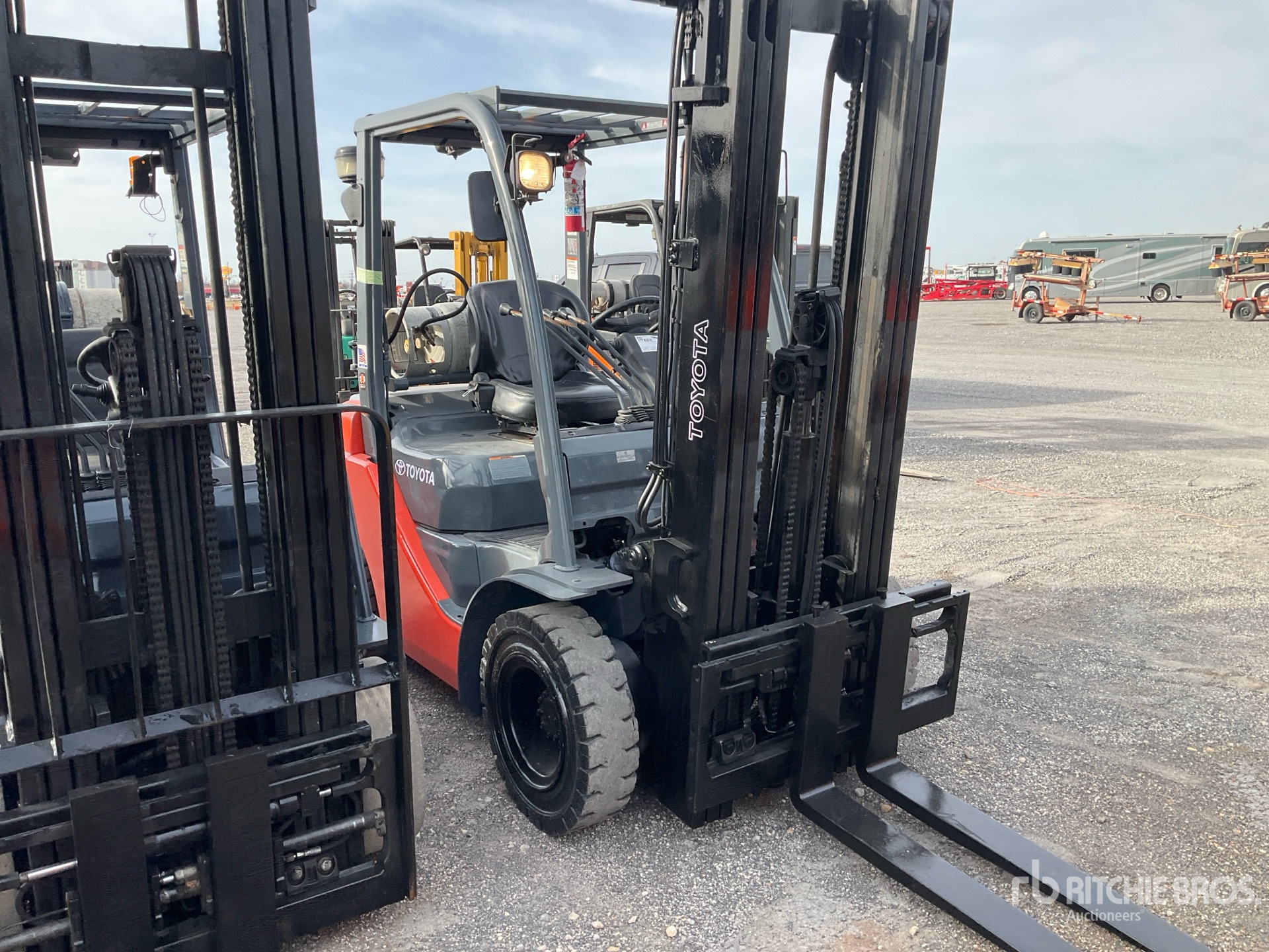 3 Stage Mast, 198 in Max Lift Height, 86 in Lowered Mast Height, 38 in Forks, Side Shift, Solid Pneumatic Tires, US EPA Label, Toyota 4YECS 4 Cylinder LPG Engine