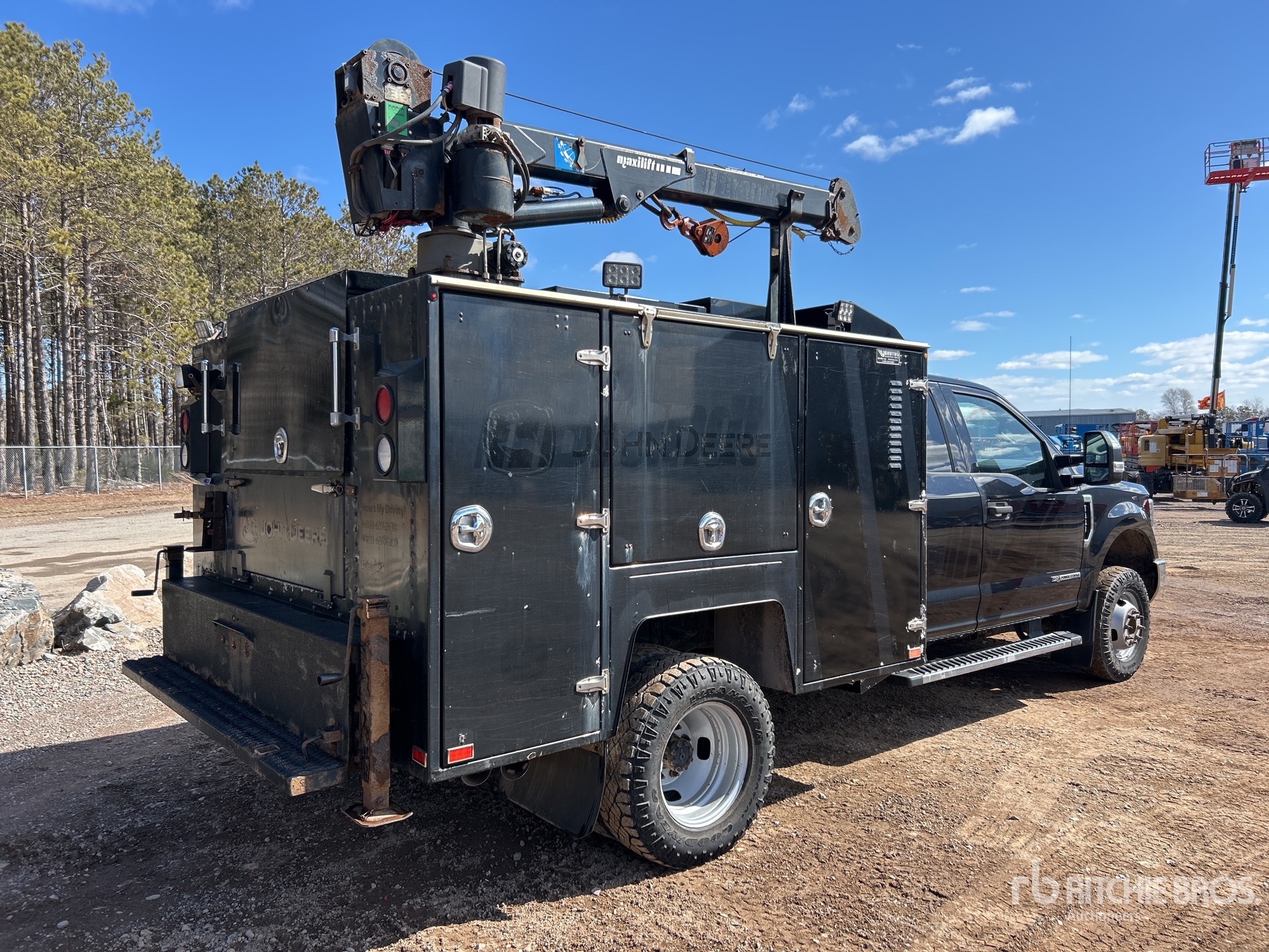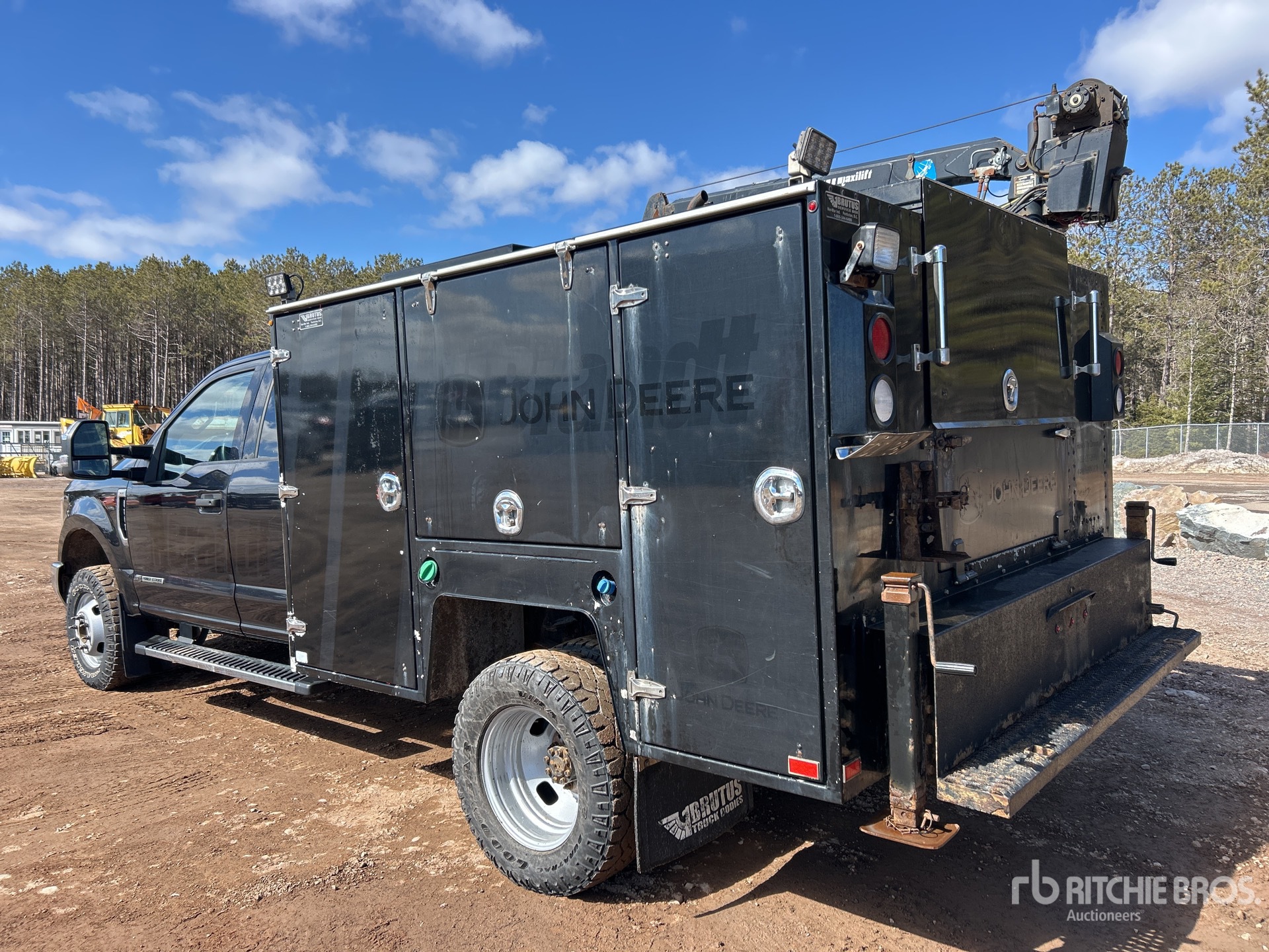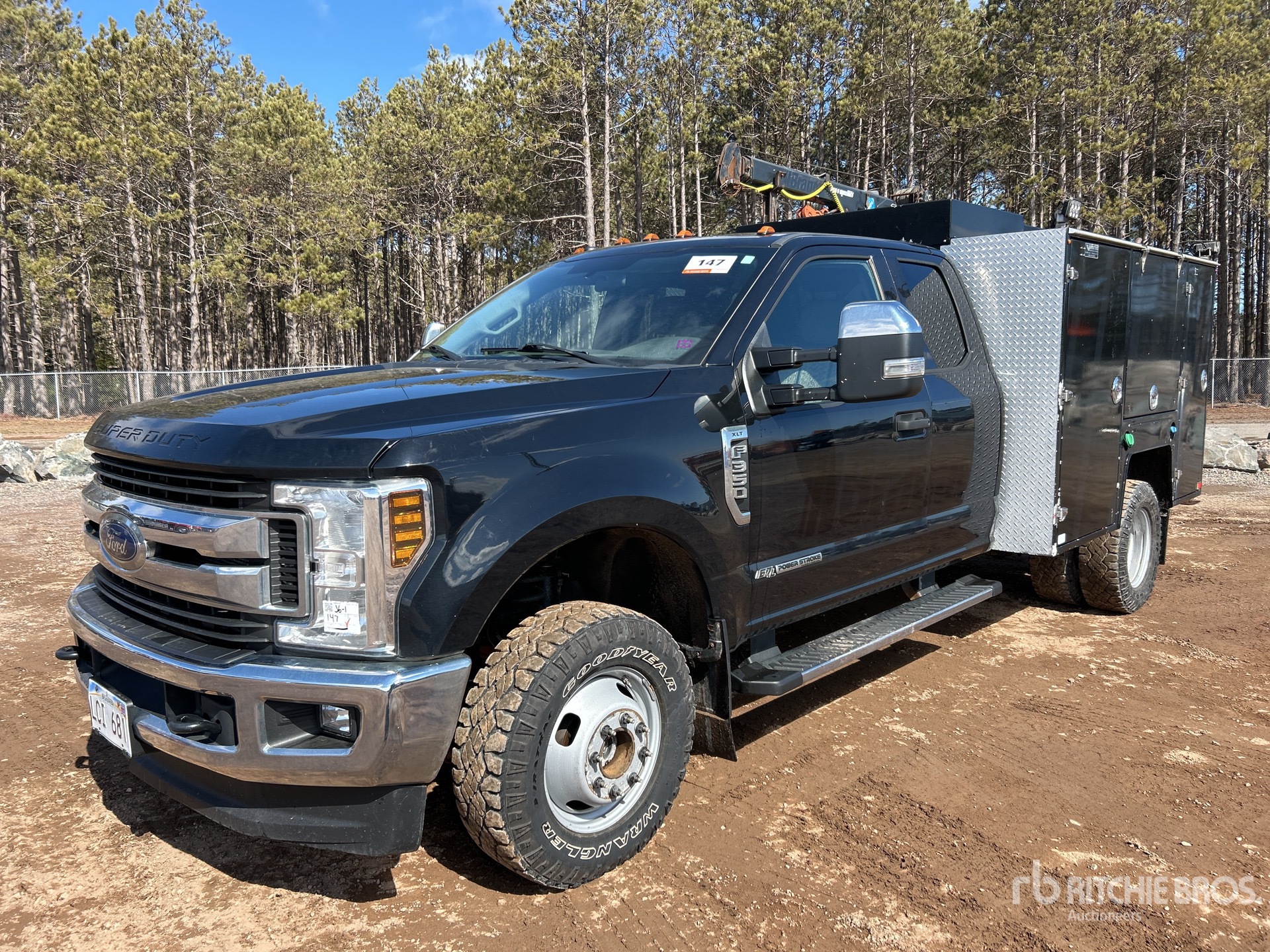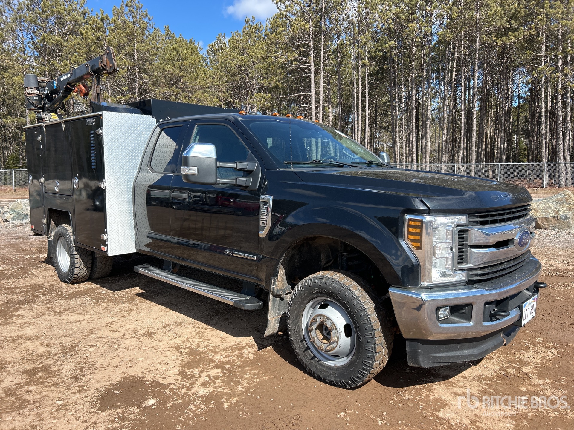 Powerstroke V8 6.7 L Diesel Engine, 2019 US EPA Label, CARB Compliant, Requires Diesel Exhaust Fluid, Positive Air Shutoff, Automatic Transmission, 5990 lb Front Axle, 9900 lb Rears, 14000 lb GVWR, 245/75R17, Spring Suspension, 164 in Wheelbase, Brutus 8 ft 6 in Body, Manual Stabilizers, 2013 Maxilift 3300KPE 3200 lb 3 Section Electric Crane, Wired Remote Control, Ingersoll-Rand 2475 Gasoline Air Compressor, Air Hose Reel, "NOTICE-TO-US-BIDDERS: this asset is likely exempt from US import tariffs as it was manufactured in the US. Bidders are responsible for confirming with their customs broker."