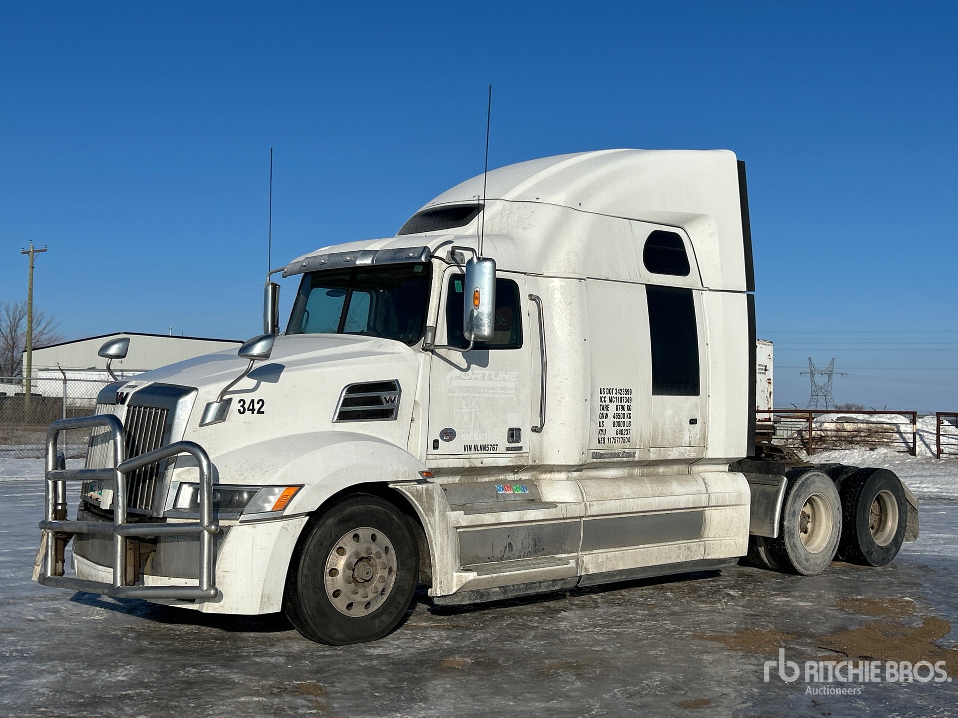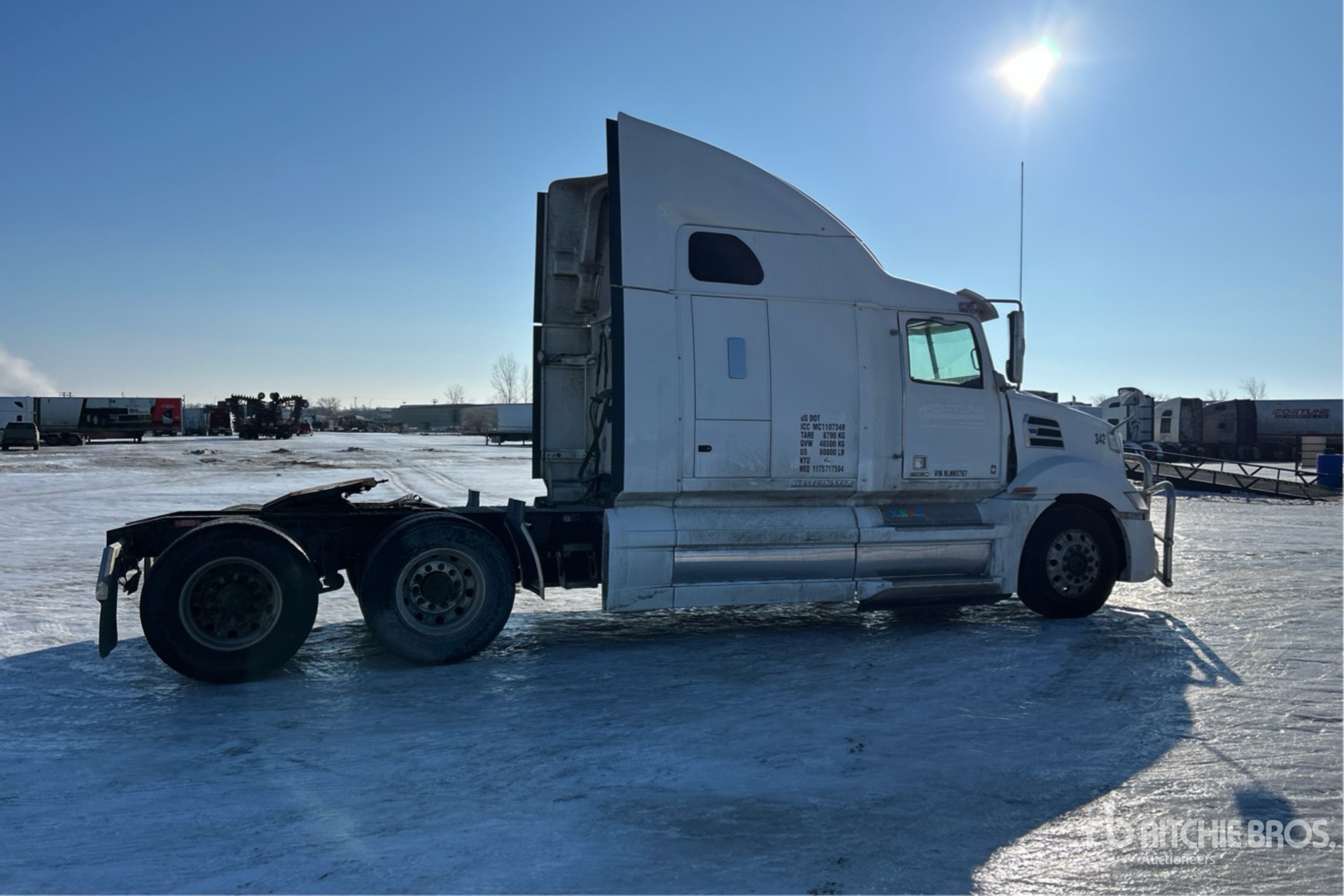 Detroit Engine, 13342 Engine hrs, Automatic Transmission, 13220 lb Front Axle, 40000 lb Rears, 53220 lb GVWR, Engine Brake, Double Differential Locks, 72 in High Rise Sleeper Cab, Bunk Beds, Bunk Heater, 241 in Wheelbase, Air Suspension, Aluminum Wheels, 11R22.5, Air Sliding 5th Wheel, Dual Fuel Tanks