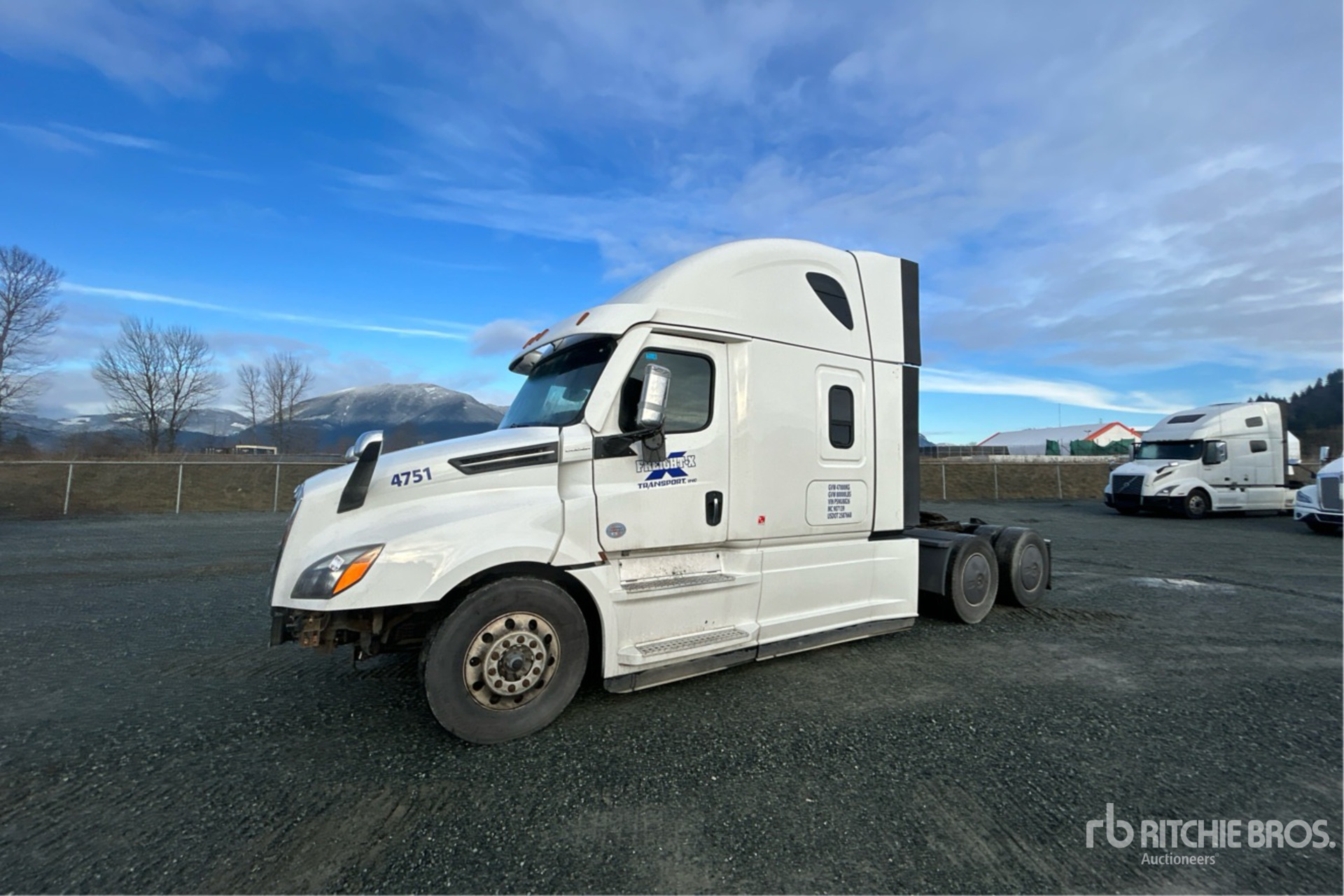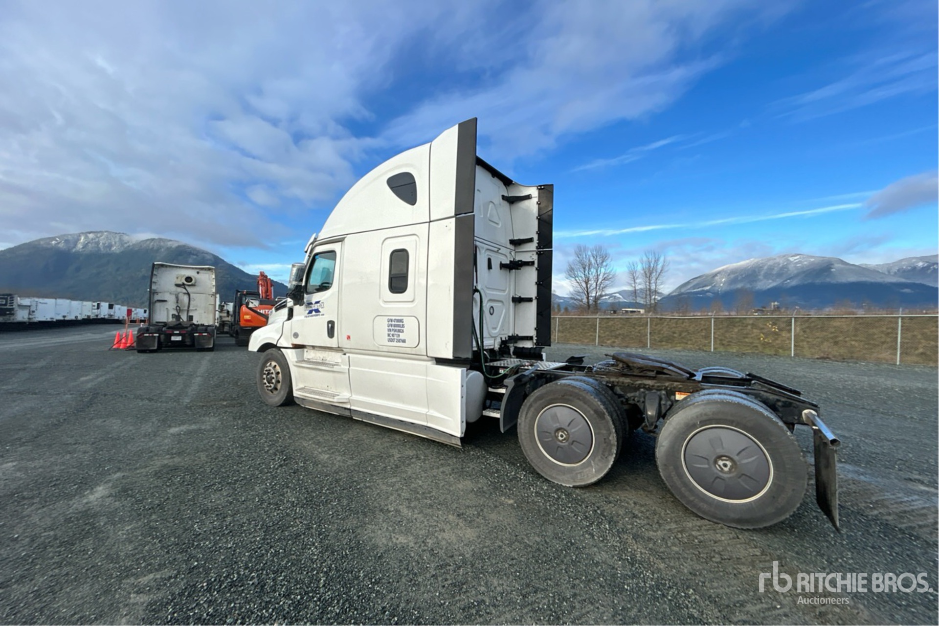 Detroit DD15 505 hp Engine, 2022 US EPA Label, 8694 Engine hrs, 13200 lb Front Axle, 40000 lb Rears, 53300 lb GVWR, Engine Brake, 58 in High Rise Sleeper Cab, Bunk Beds, 214 in Wheelbase, Air Suspension, Air Lift Pusher Axle, Aluminum Wheels, 11R22.5 Front Tires, 275/80R22.5 Rear Tires, Air Sliding 5th Wheel, Dual Fuel Tanks
