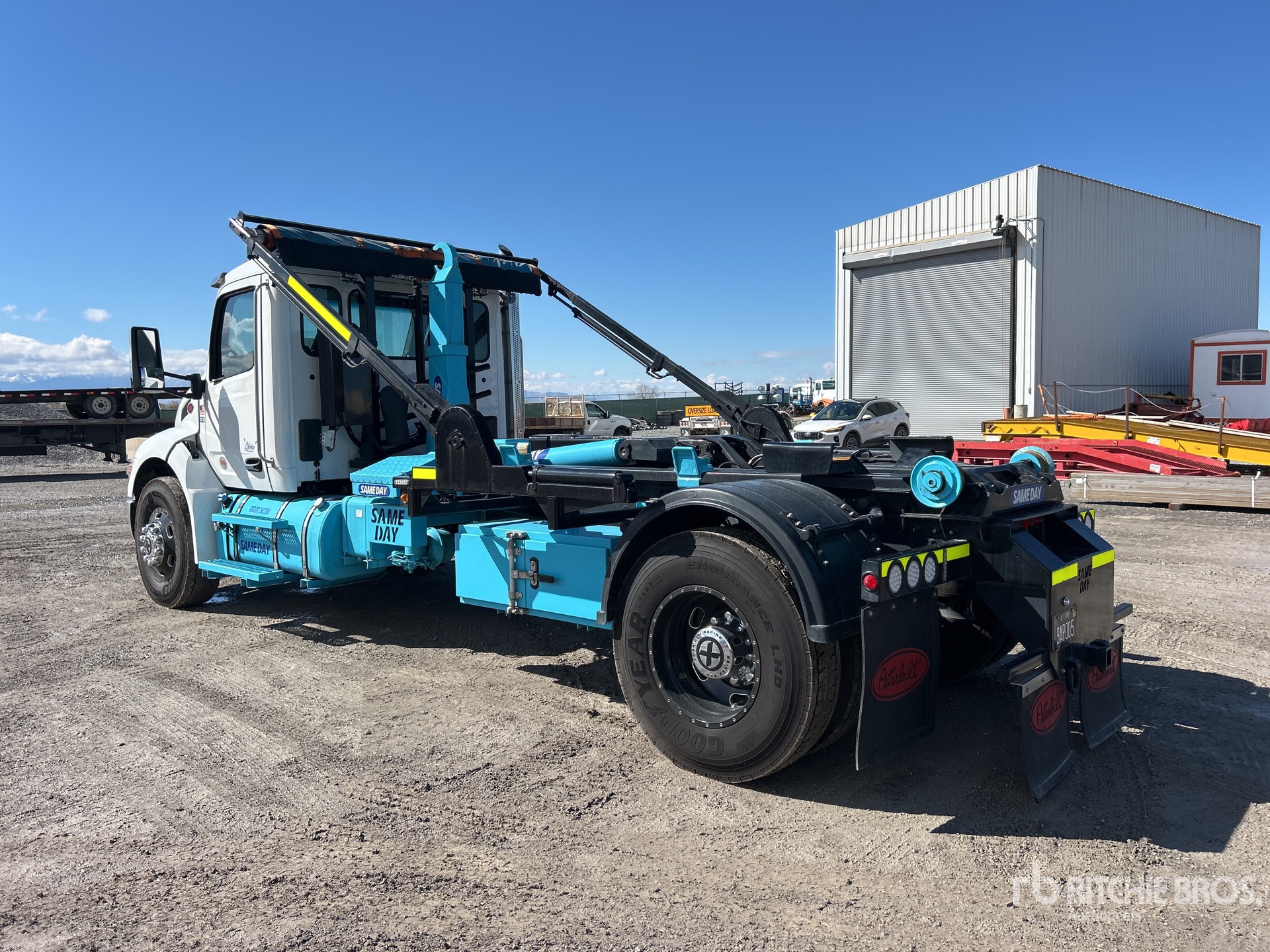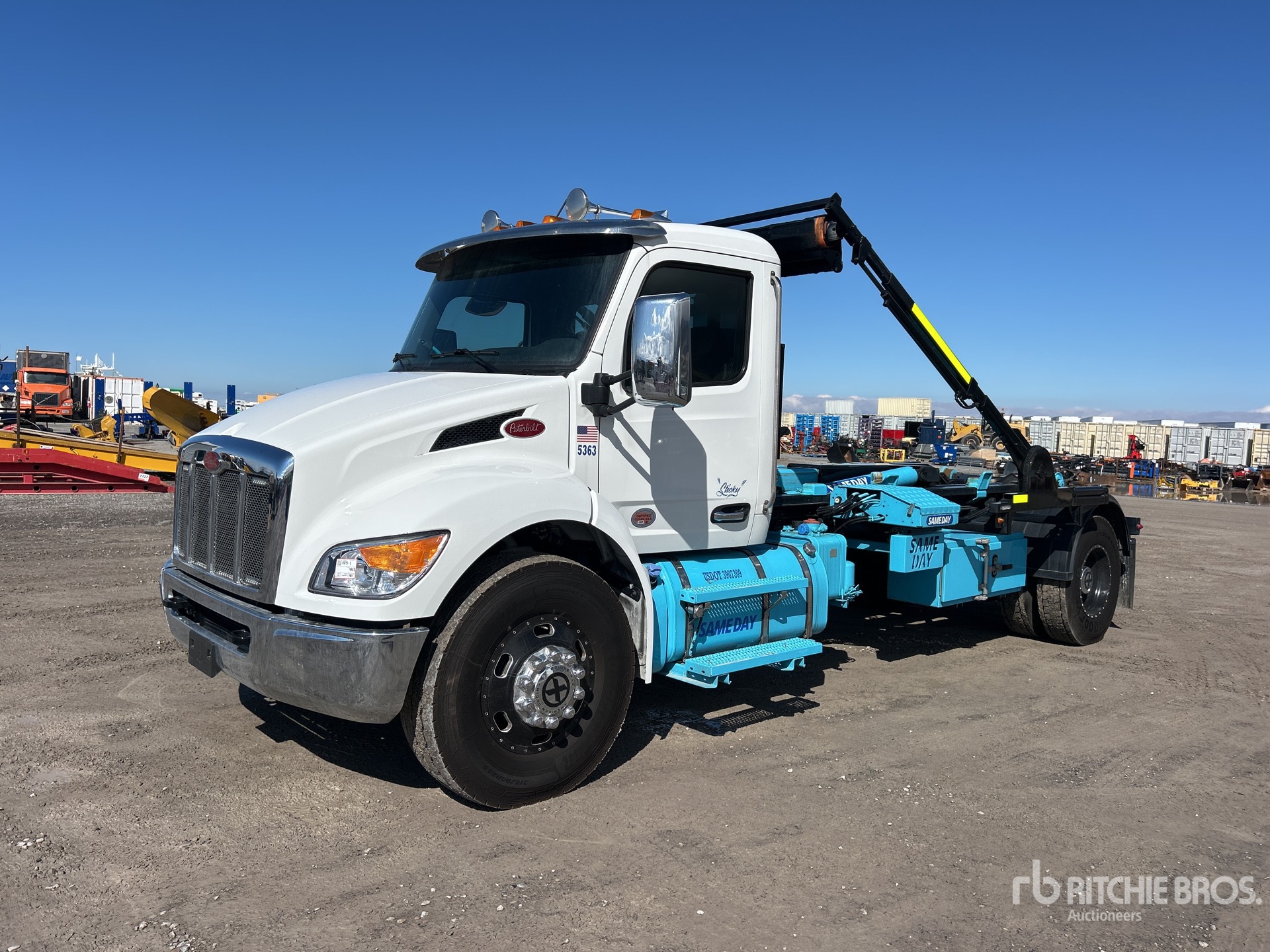 Paccar PX-9 6 Cylinder 8.9 L Diesel 160 hp Engine, 2024 US EPA Label, Requires Diesel Exhaust Fluid, 1464 Engine hrs, Engine Brake, Allison 6-Speed Automatic Transmission, 10000 lb Front Axle, 20000 lb Rears, 26000 lb GVWR, 315/80R22.5 Front Tires, 11R22.5 Rear Tires, Paccar Air Ride Suspension, 222 in Wheelbase, PTO, Palfinger T-29MT Roll-Off Body, 14 ft Hoist