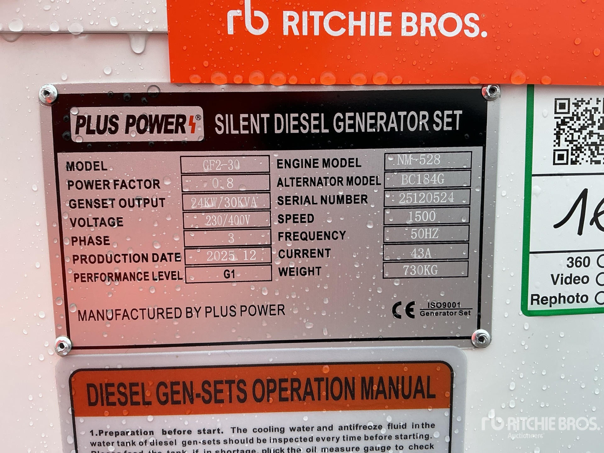4 Cylinder Diesel Engine, /24 kW Rated 3 Phase Output, / 230 V / 400 V Rated Voltage, Sound Attenuated, 1500RPM, 43A, 50Hz