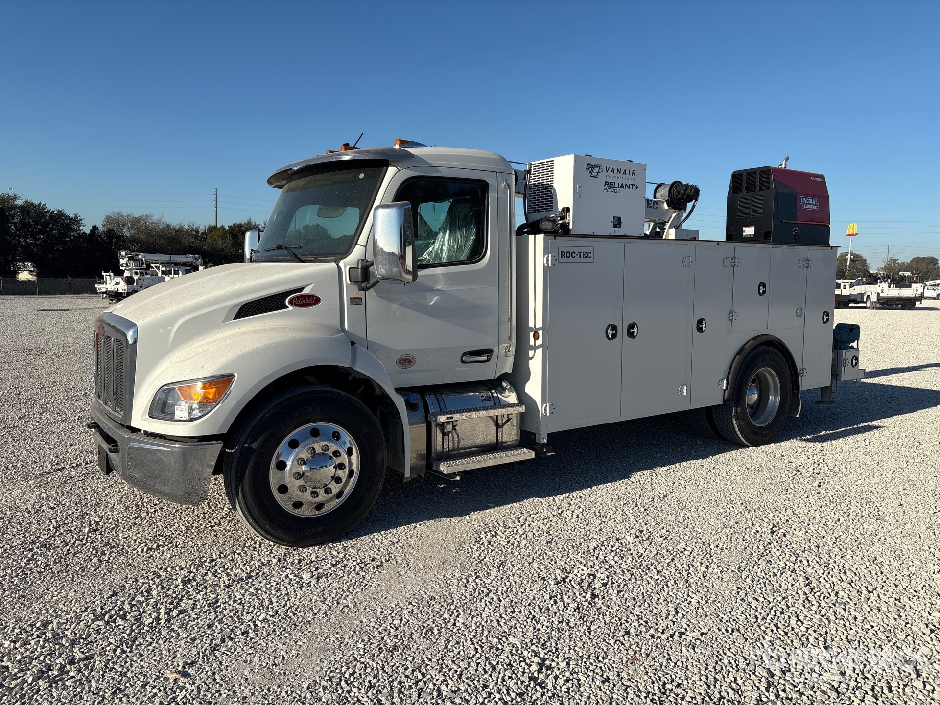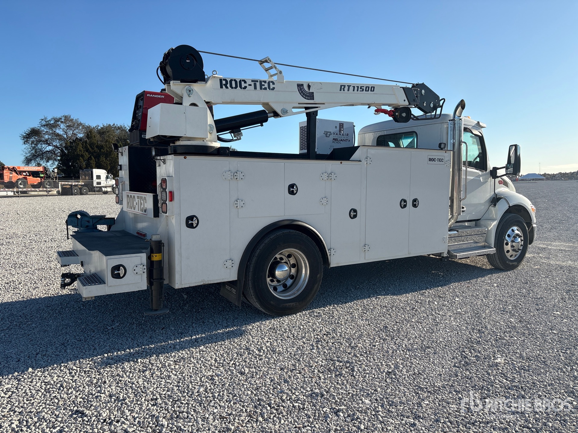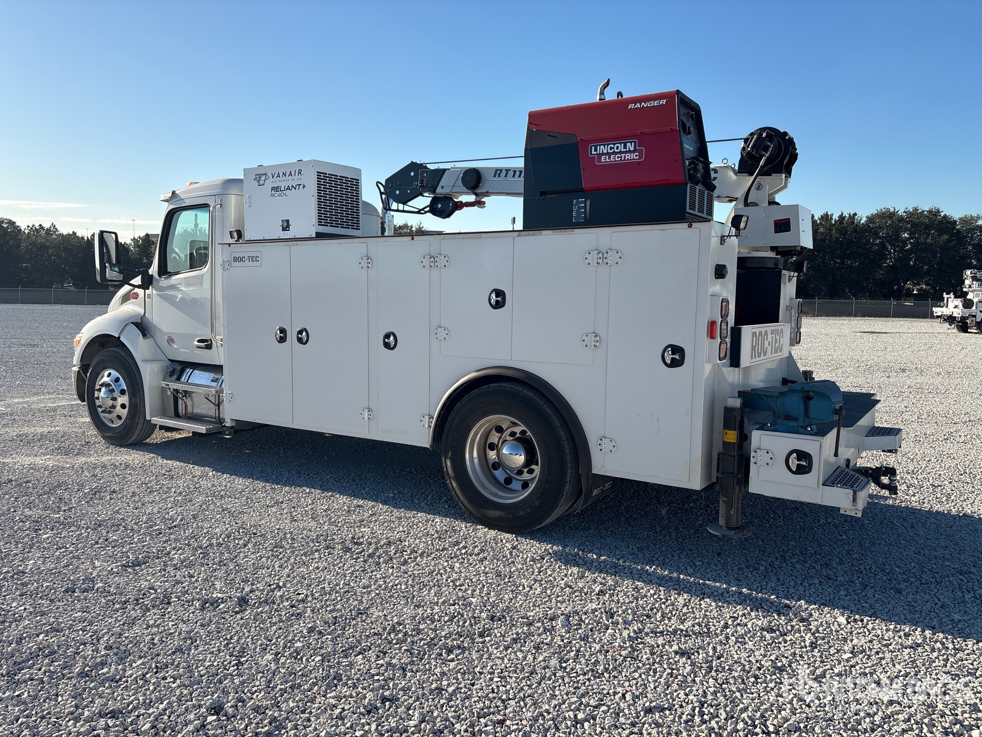 Paccar PX-7 6 Cylinder 6.7 L Diesel Engine, 2025 US EPA Label, Requires Diesel Exhaust Fluid, 10 Engine hrs, Engine Brake, Allison Automatic Transmission, 10000 lb Front Axle, 18000 lb Rears, 26000 lb GVWR, Air Ride Cab, Aluminum Wheels, 295/75R22.5, Air Ride Suspension, 188 in Wheelbase, PTO, 2025 Roc-Tec RT11500 16 ft 6 in Body, Hydraulic Stabilizers, 2025 Roc-Tec RT11500 11500 lb 2 Section Hydraulic Crane, Wireless Remote Control, Lincoln Ranger 225 10500 W Gasoline Generator Set, Vanair RC40L Hydraulic Air Compressor, Air Hose Reel, Lincoln Ranger 225 9000 W 225 A Gasoline Welder, Equipment-from-D-and-B-Trucks-and-Equipment
