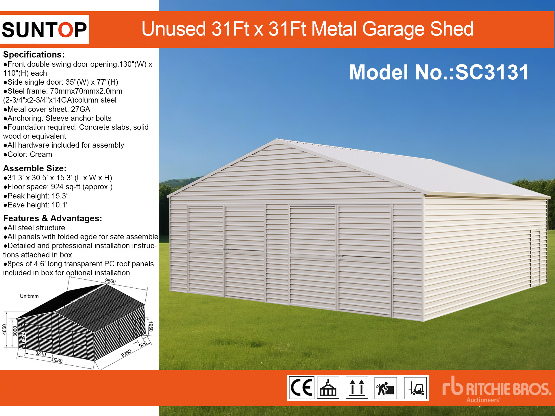 2026 SUNTOP SC3131 31 ft x 31 ft Double Garage Metal Cobertizo (Unused)
