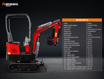 US EPA Label, 2 ft 7 in Stick, Auxiliary Hydraulic Plumbing, Backfill Blade, 7 in Rubber Tracks, 16 in Digging Bucket, Manual Thumb, Product images displayed are stock photos. Item is new/unused.