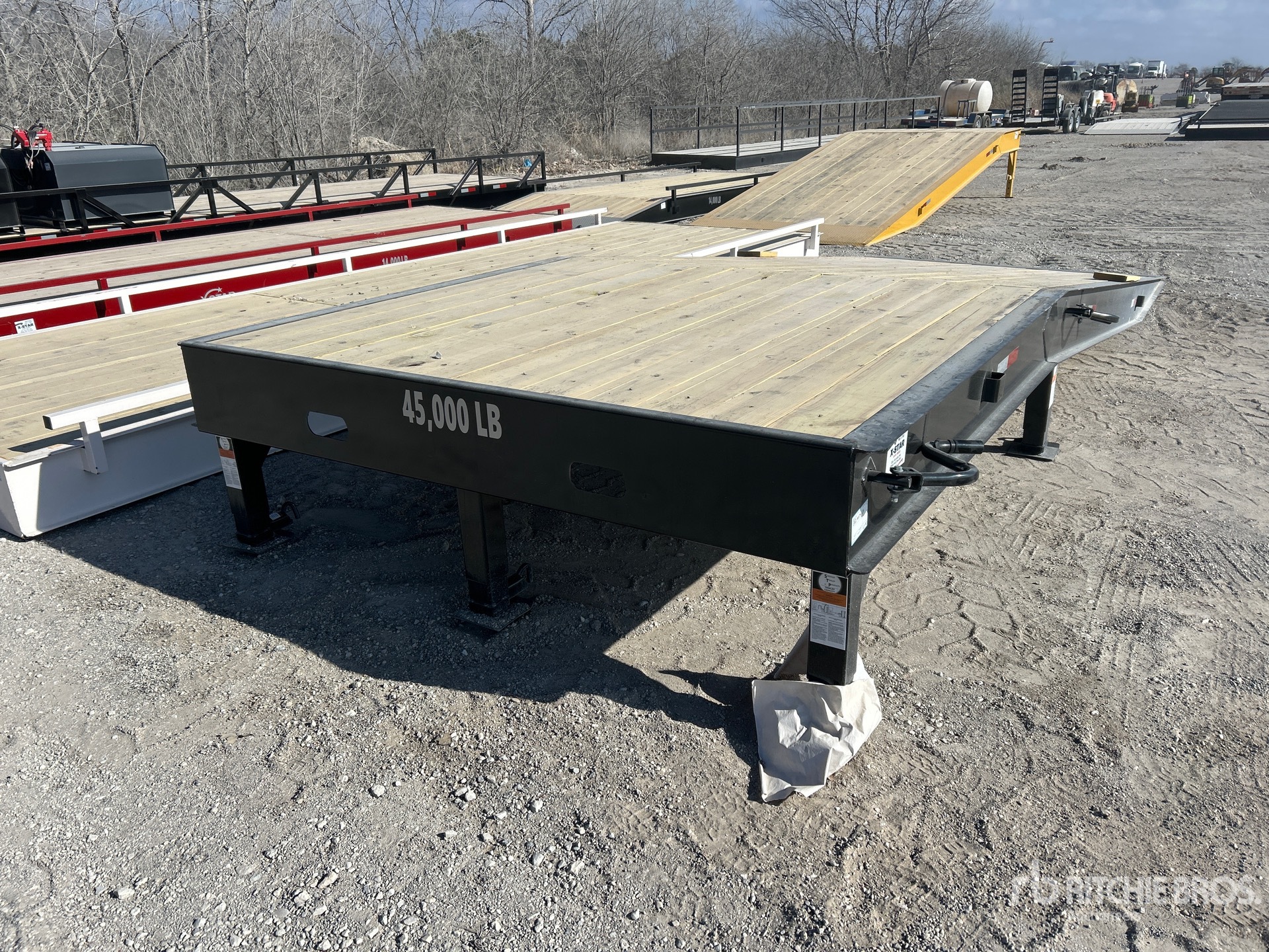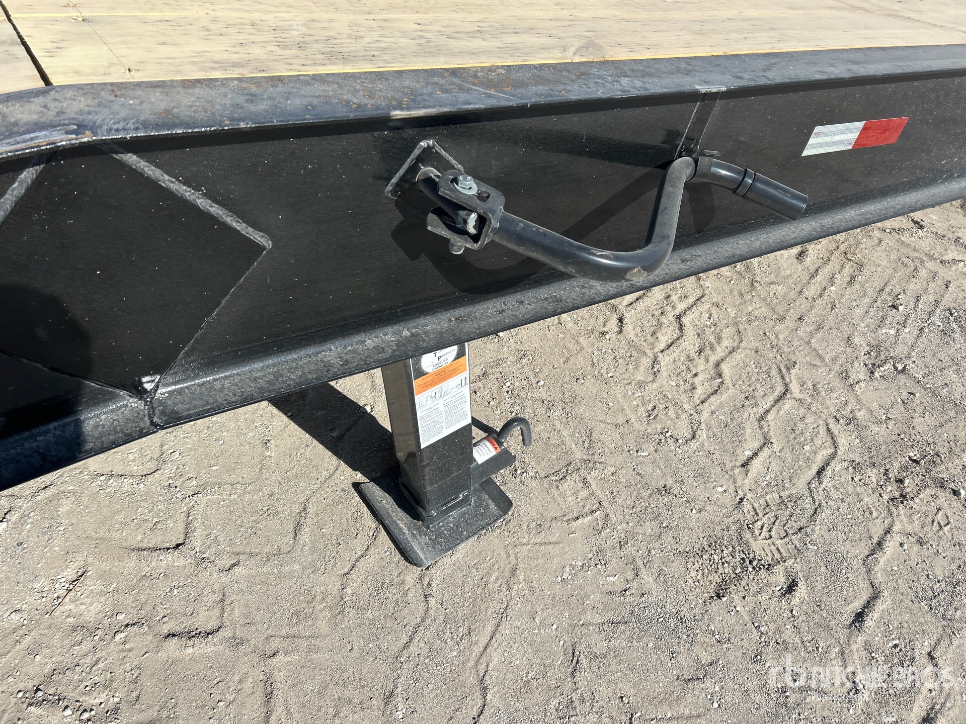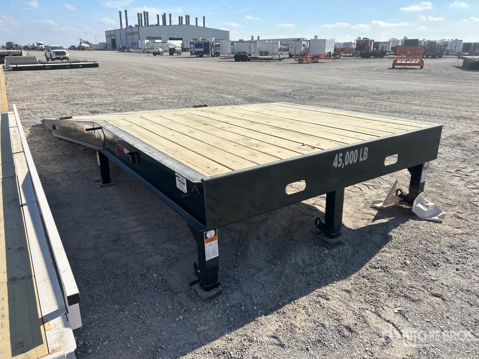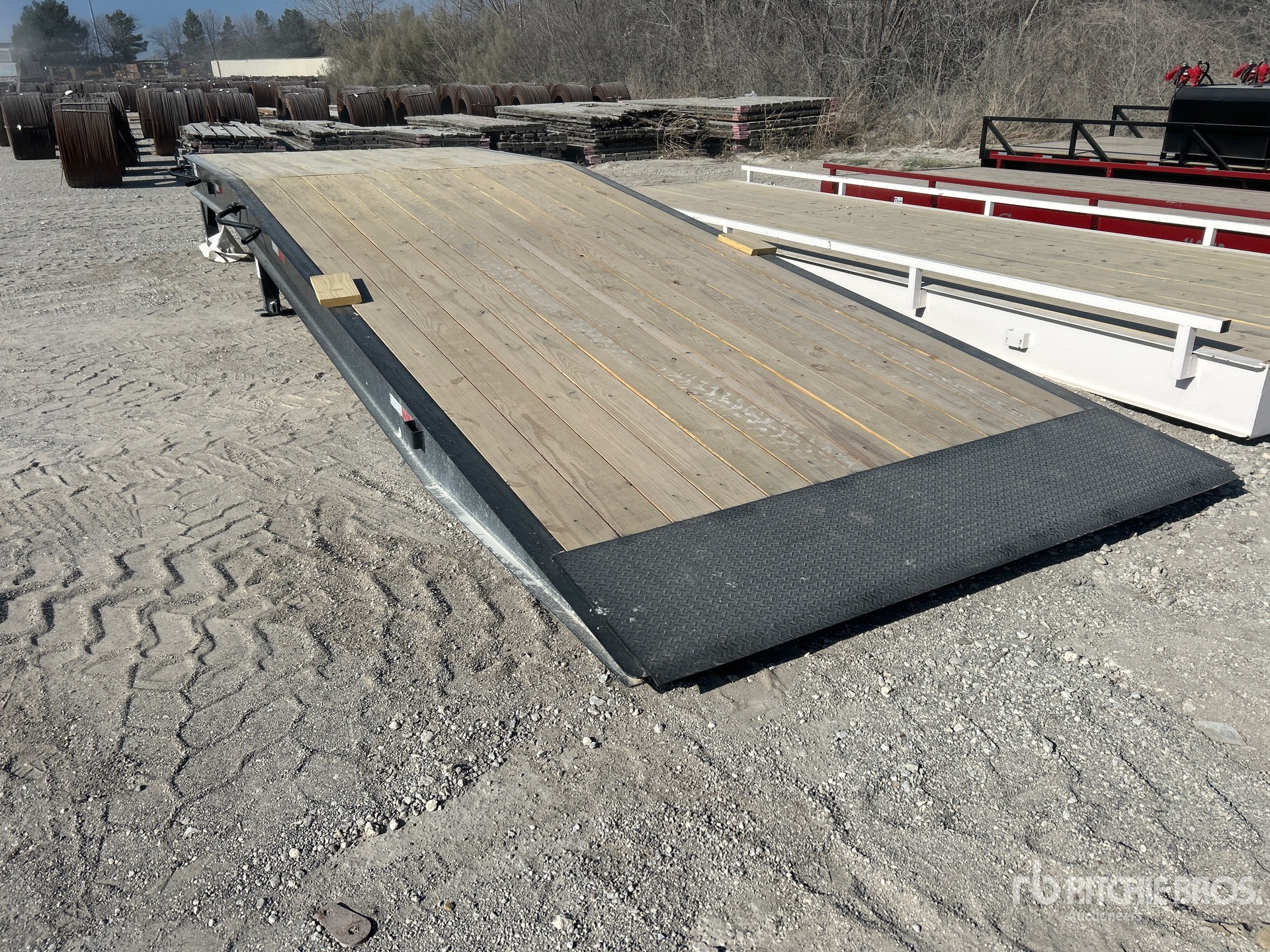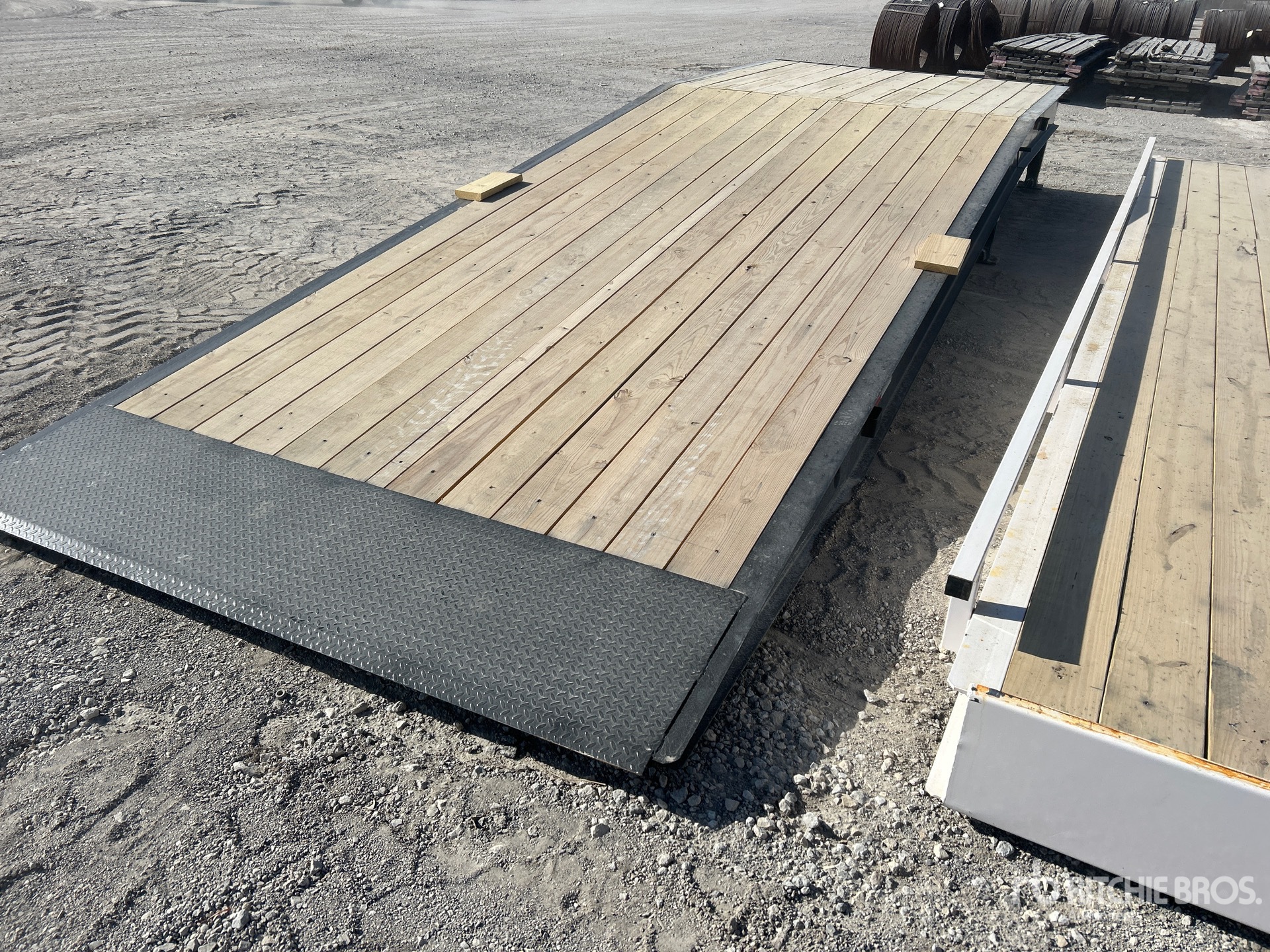 25 ft x 101 in Loading ramp, 12 in x 14 lbs I-beam frame, 5 in channel in the middle, 3 in Channel crossmembers, 2 in x 8 in Lumber floor, 18 ft long angled ramp with 7 ft flat surface, 5-10K adjustable jacks.